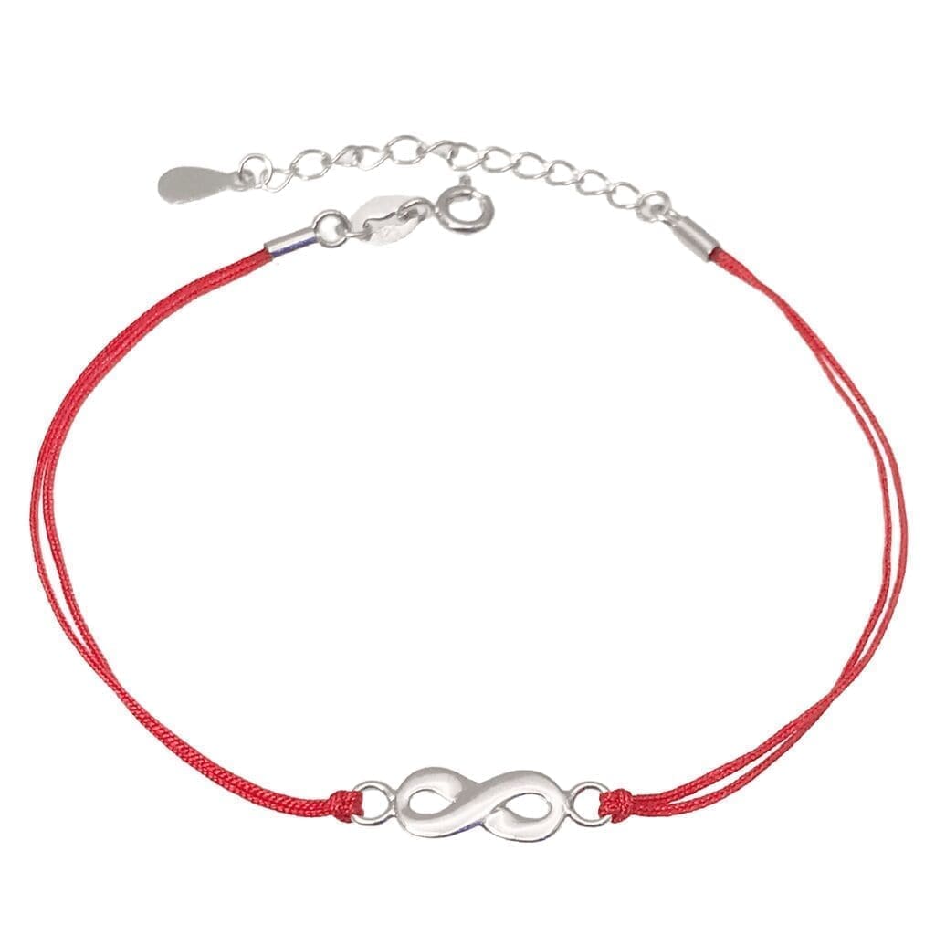 Rotes Baumwoll-Fußkettchen mit silbernem Unendlichkeitssymbol – ein Symbol für Ewigkeit und Schutz