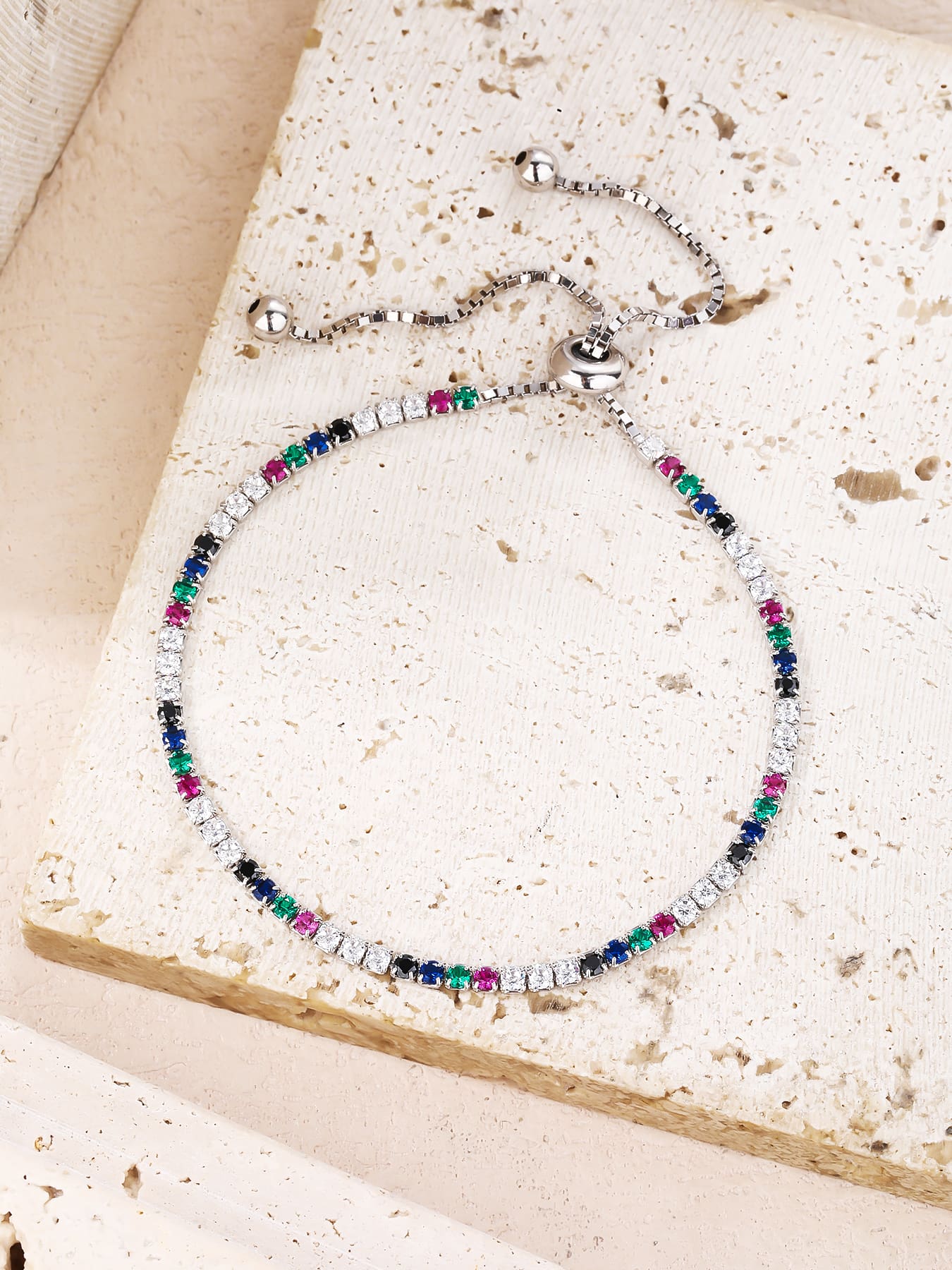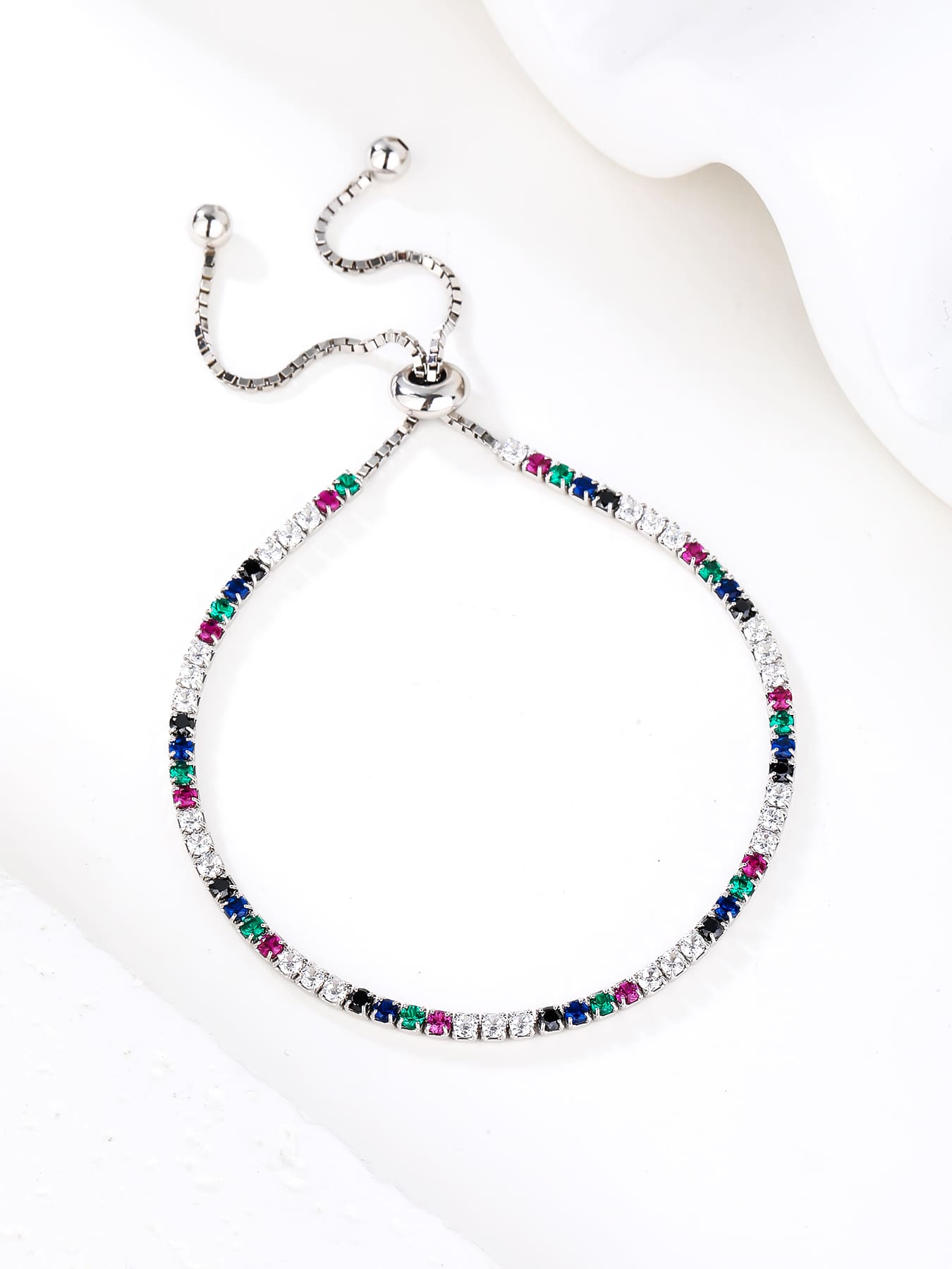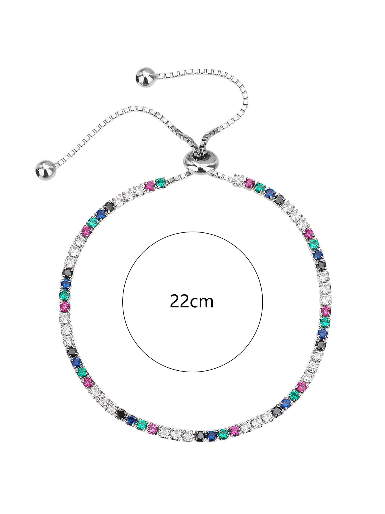 Dieses hübsche Armband bringt eine Harmonie aus Farbe und Glanz. Die winzigen Zirkoniasteine in verschiedenen Farben (rosa, blau, grün, weiß, schwarz) schimmern sanft, während die 925er Silberbasis den perfekten Glanz verleiht. Das Schiebeschloss ist eine praktische Lösung, so dass es sich bequem auf die gewünschte Größe einstellen lässt.