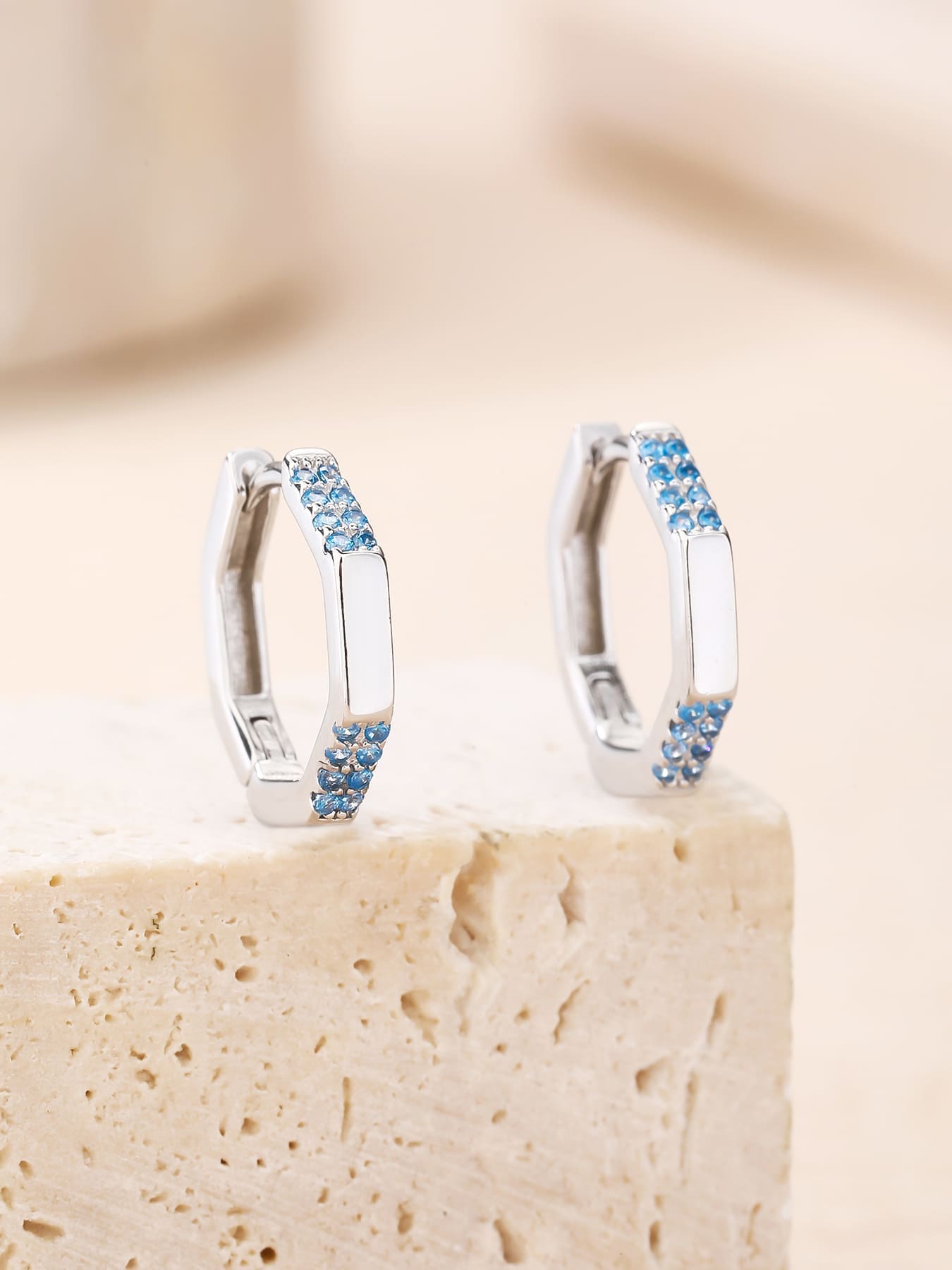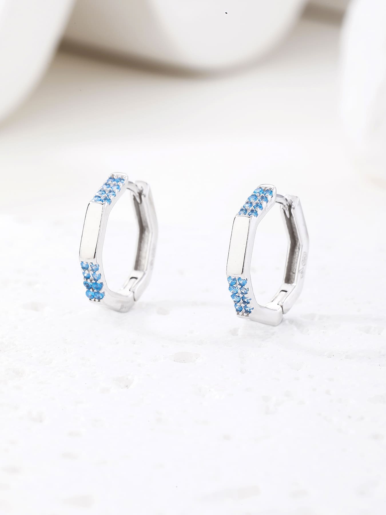 Diese achteckigen Ohrringe aus AG 925 Sterlingsilber bieten einen frischen, verspielten Look. Die hellblauen Steine erinnern an die Farben des Frühlingshimmels und die Ruhe, während die geometrische Form den Ohrringen einen modernen Charakter verleiht.