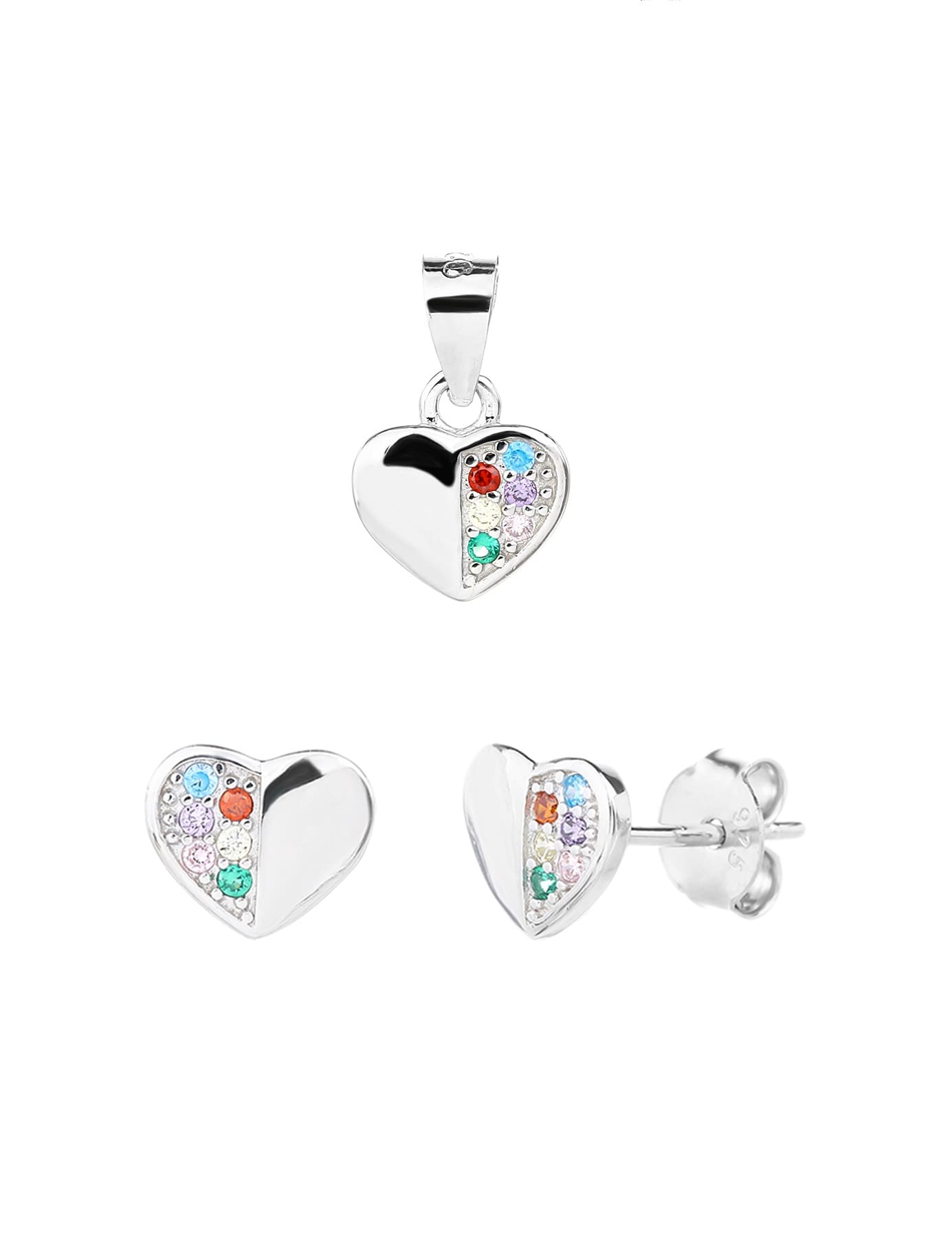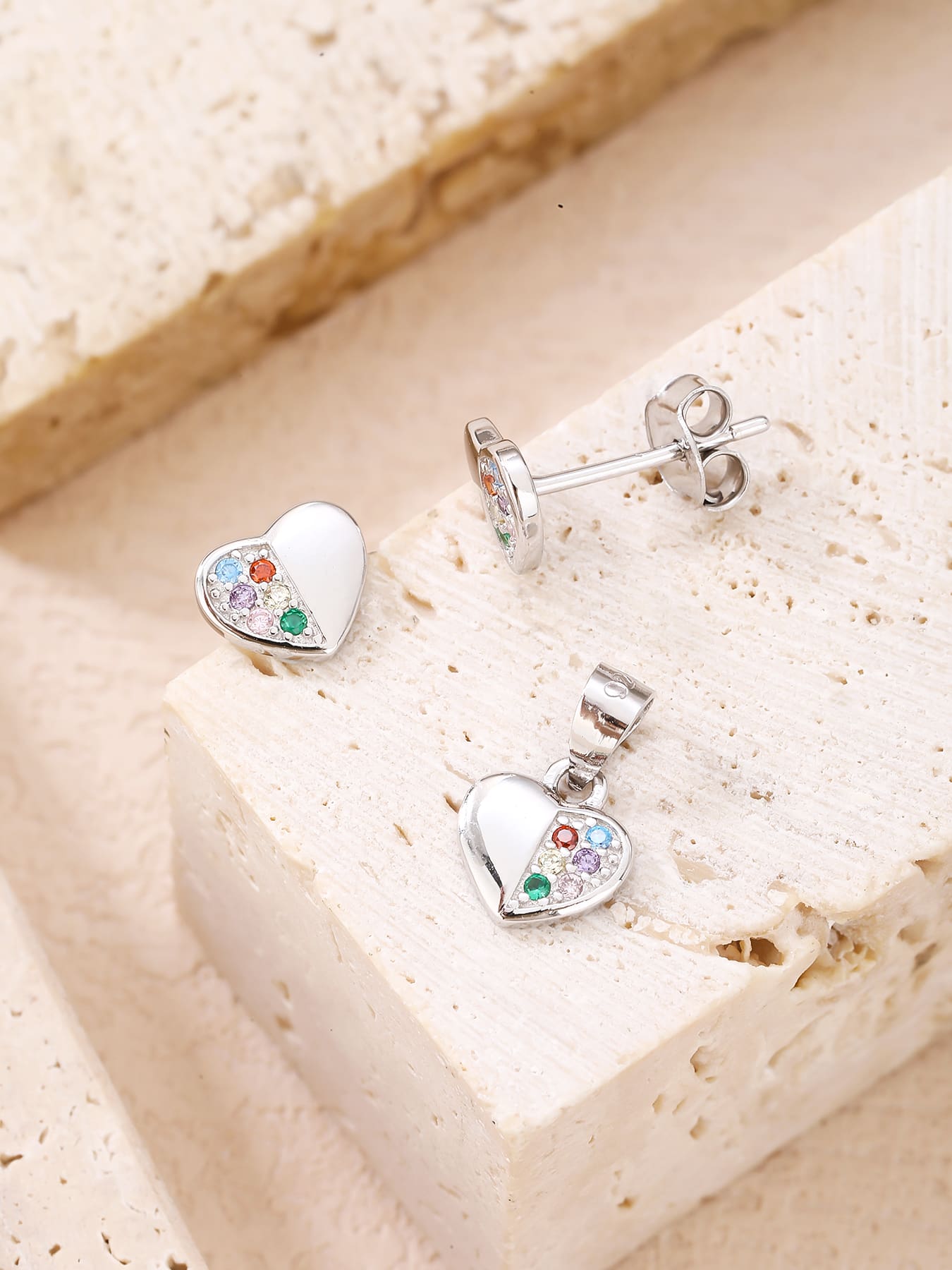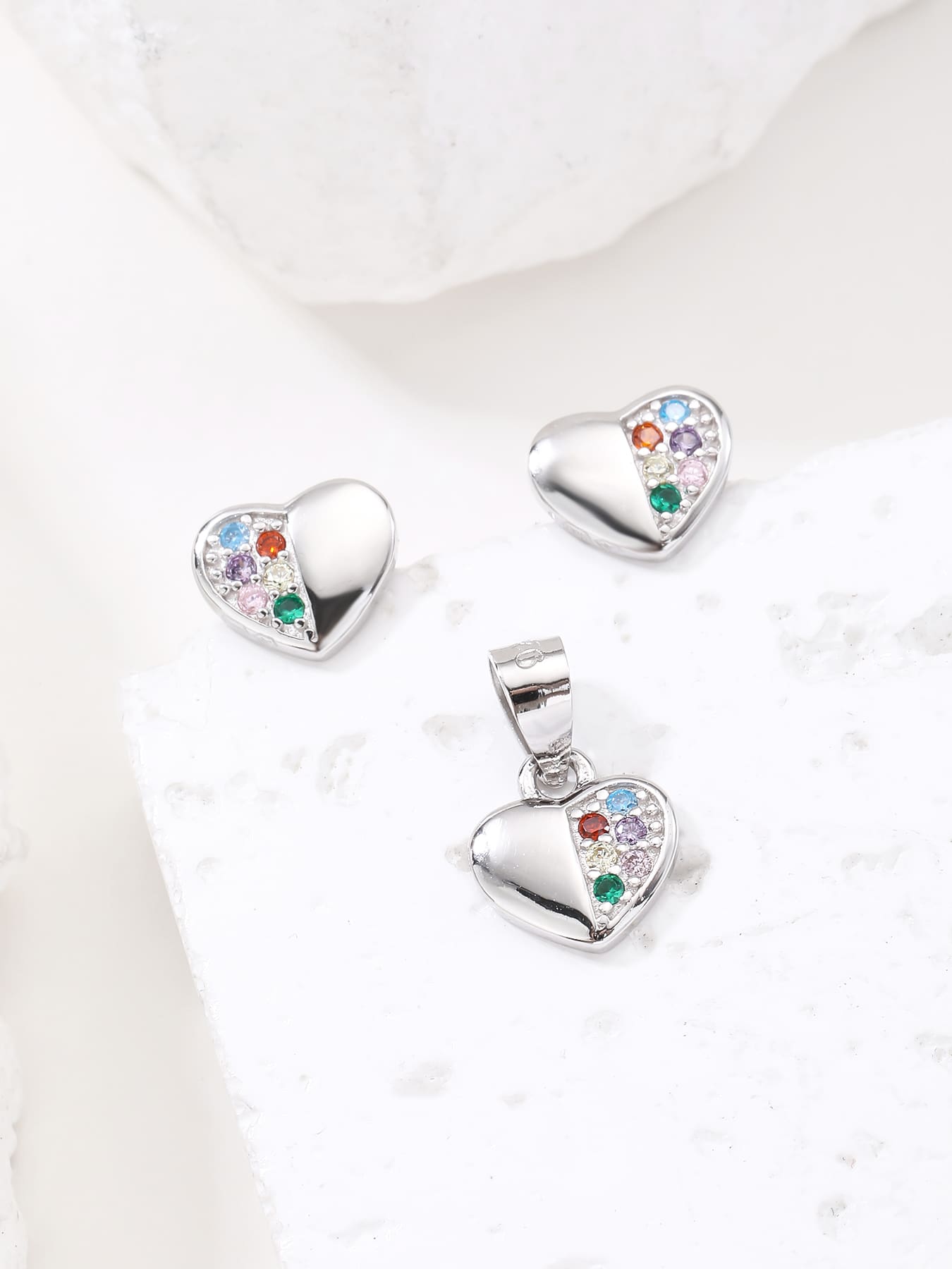 Dieses silberne Set ist für diejenigen, die gerne mit Farben spielen, aber dennoch einen eleganten Look beibehalten möchten. Die klassische Herzform ist zur einen Hälfte aus einfachem Silber und zur anderen Hälfte mit bunten Steinen verziert – eine Dichotomie, die die Vielfalt und Verschiedenheit in uns perfekt zum Ausdruck bringt. 🌸🌟