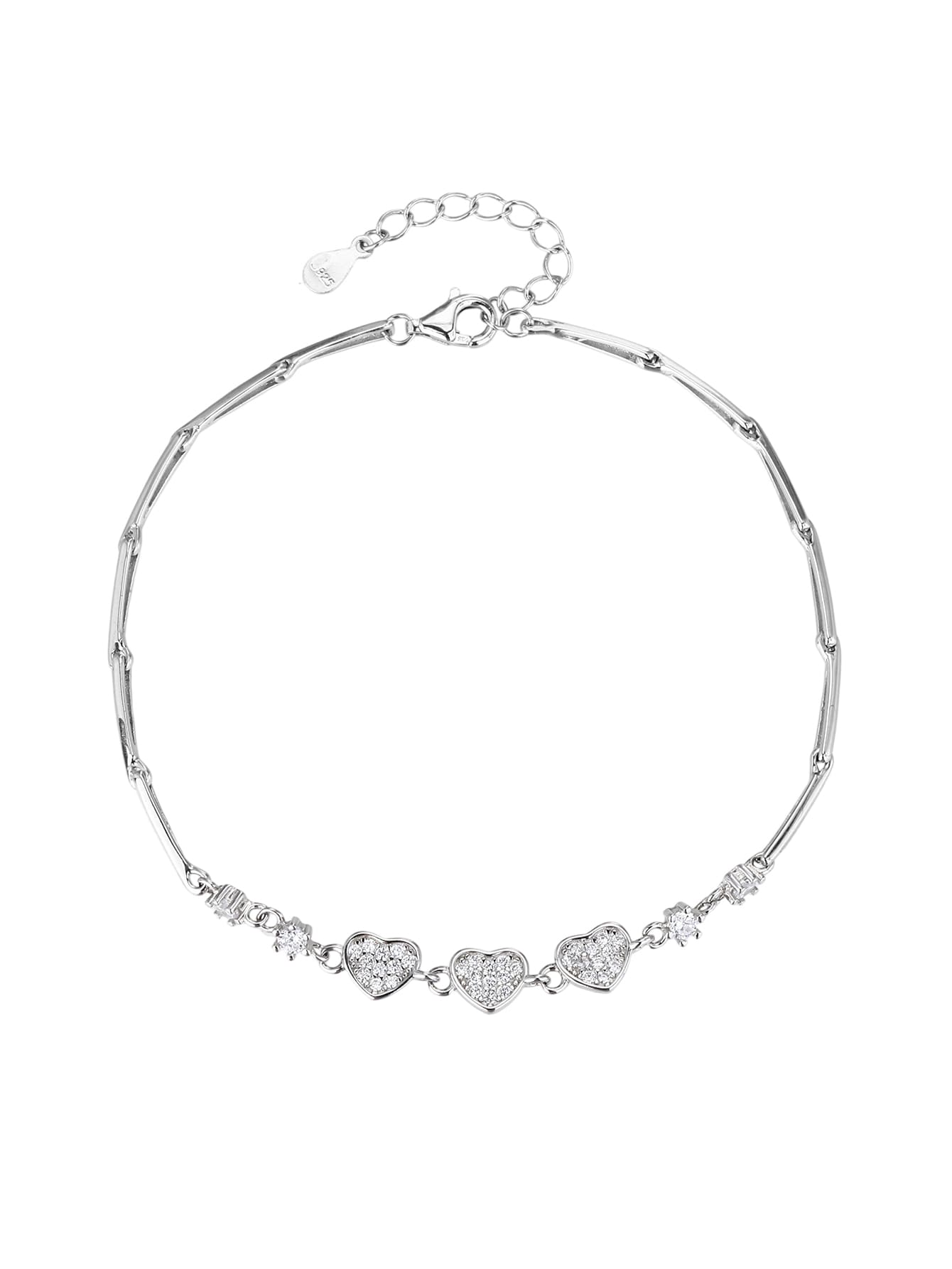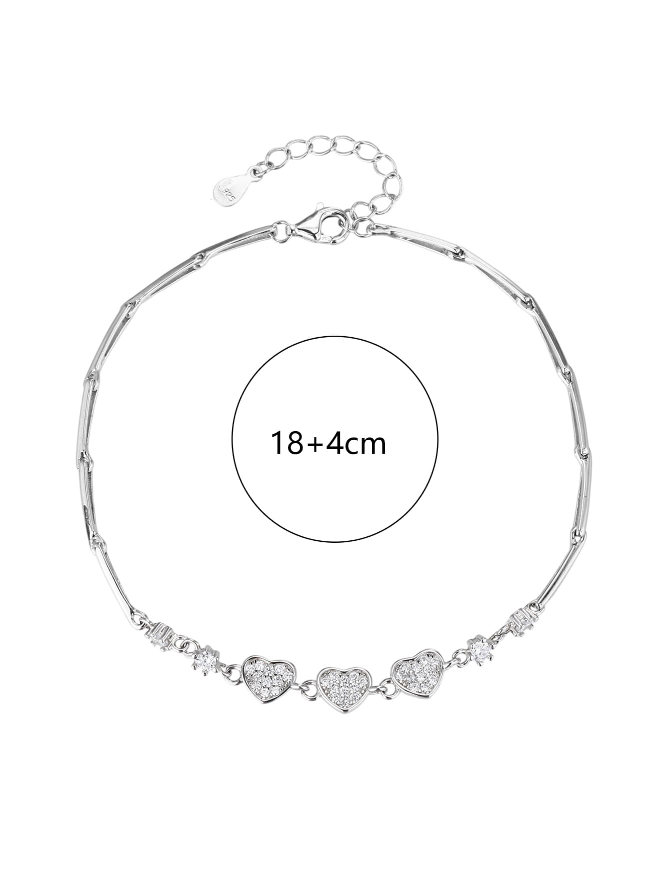 Dieses besondere Armband, das in der Länge von 18+4 cm verstellbar ist, ist mit drei schimmernden Zirkonia-Herzen verziert, Symbole für Liebe, Harmonie und Glück. Zarte Glieder und winzige Steine rahmen die Herzmotive elegant ein und machen das Armband sowohl romantisch als auch raffiniert.