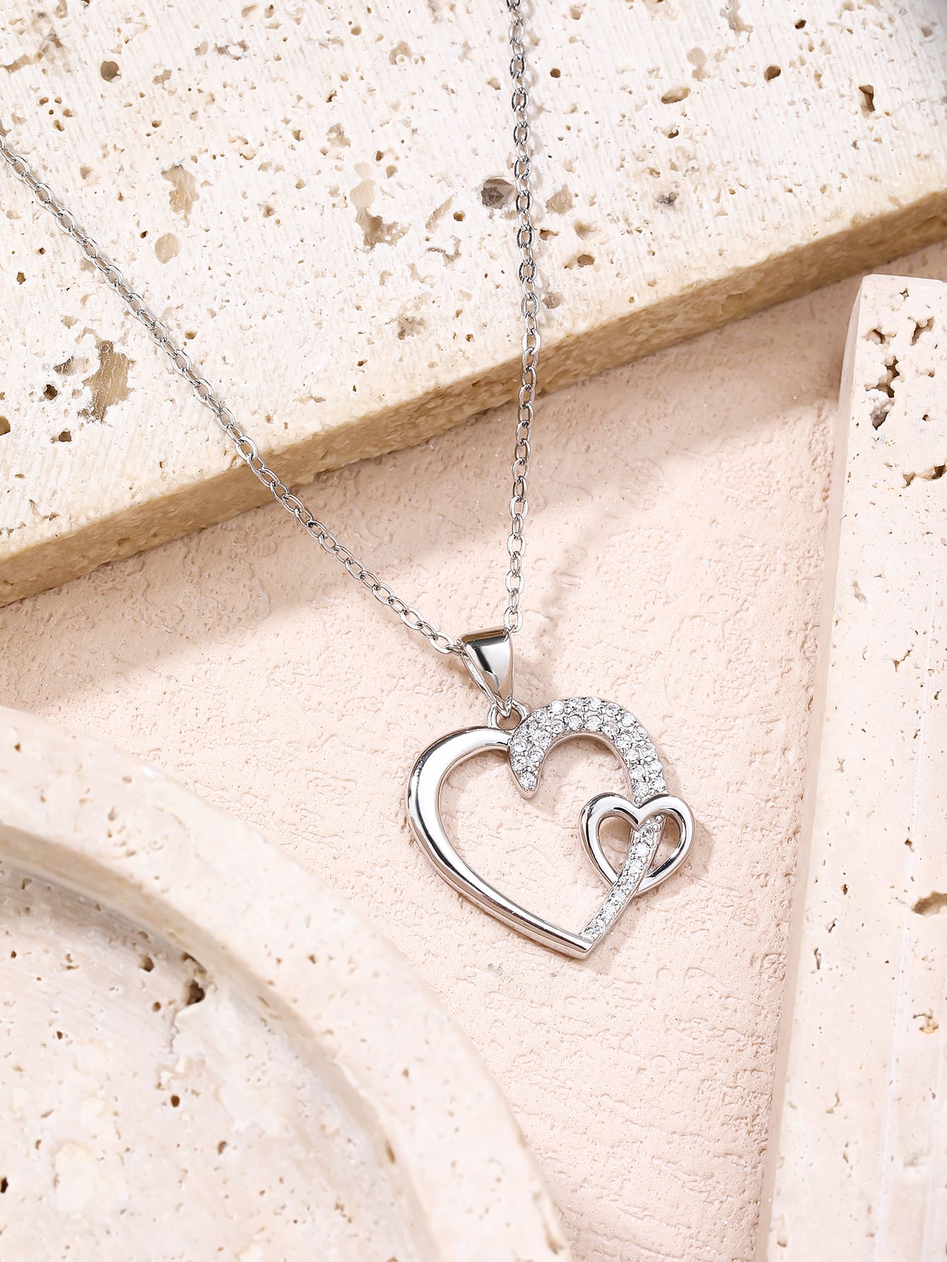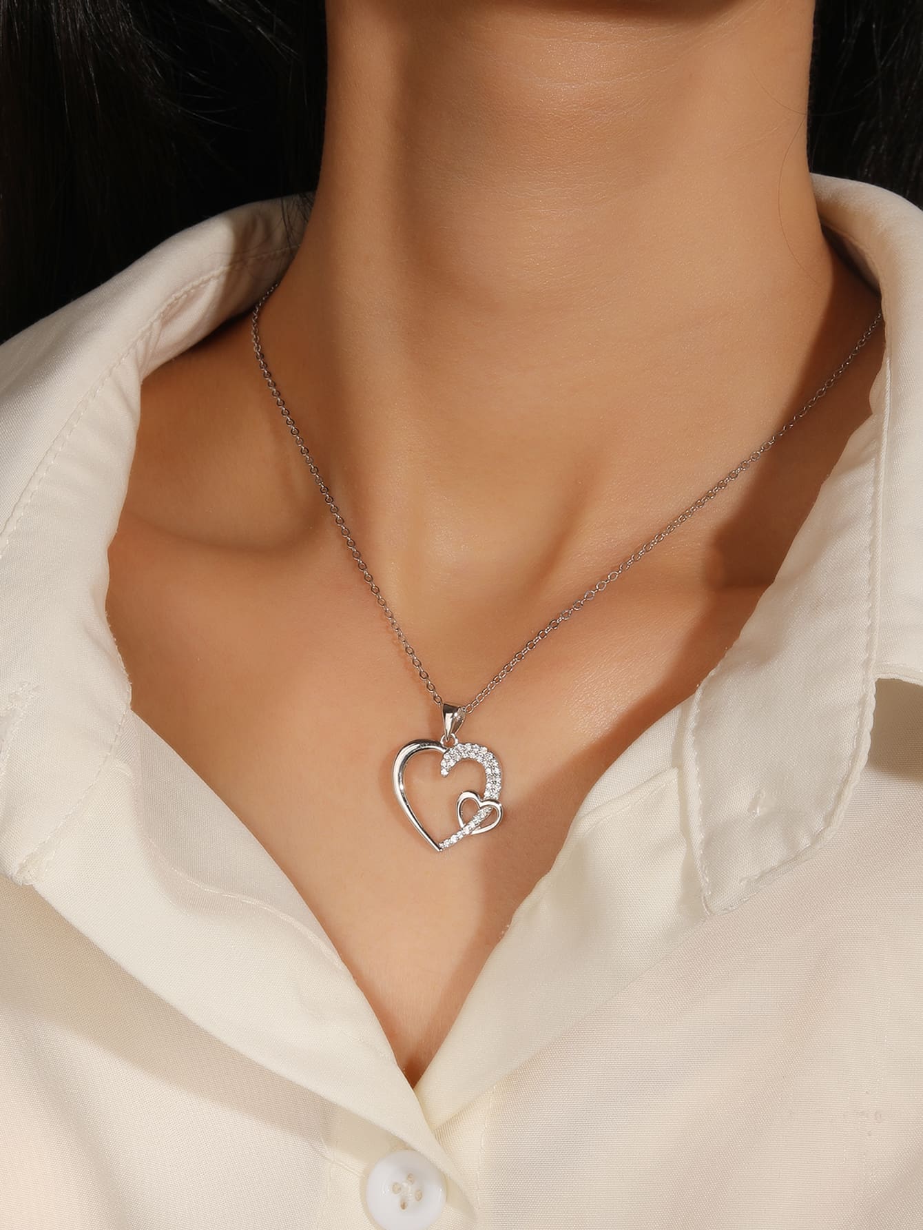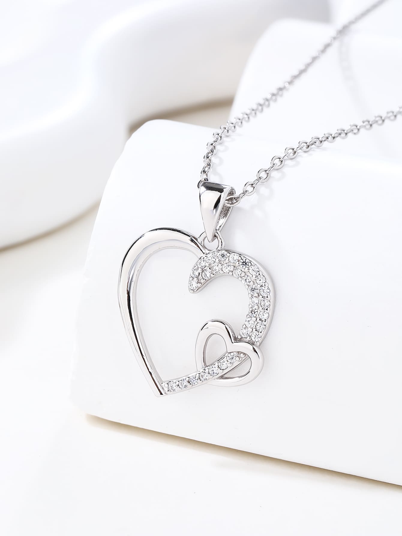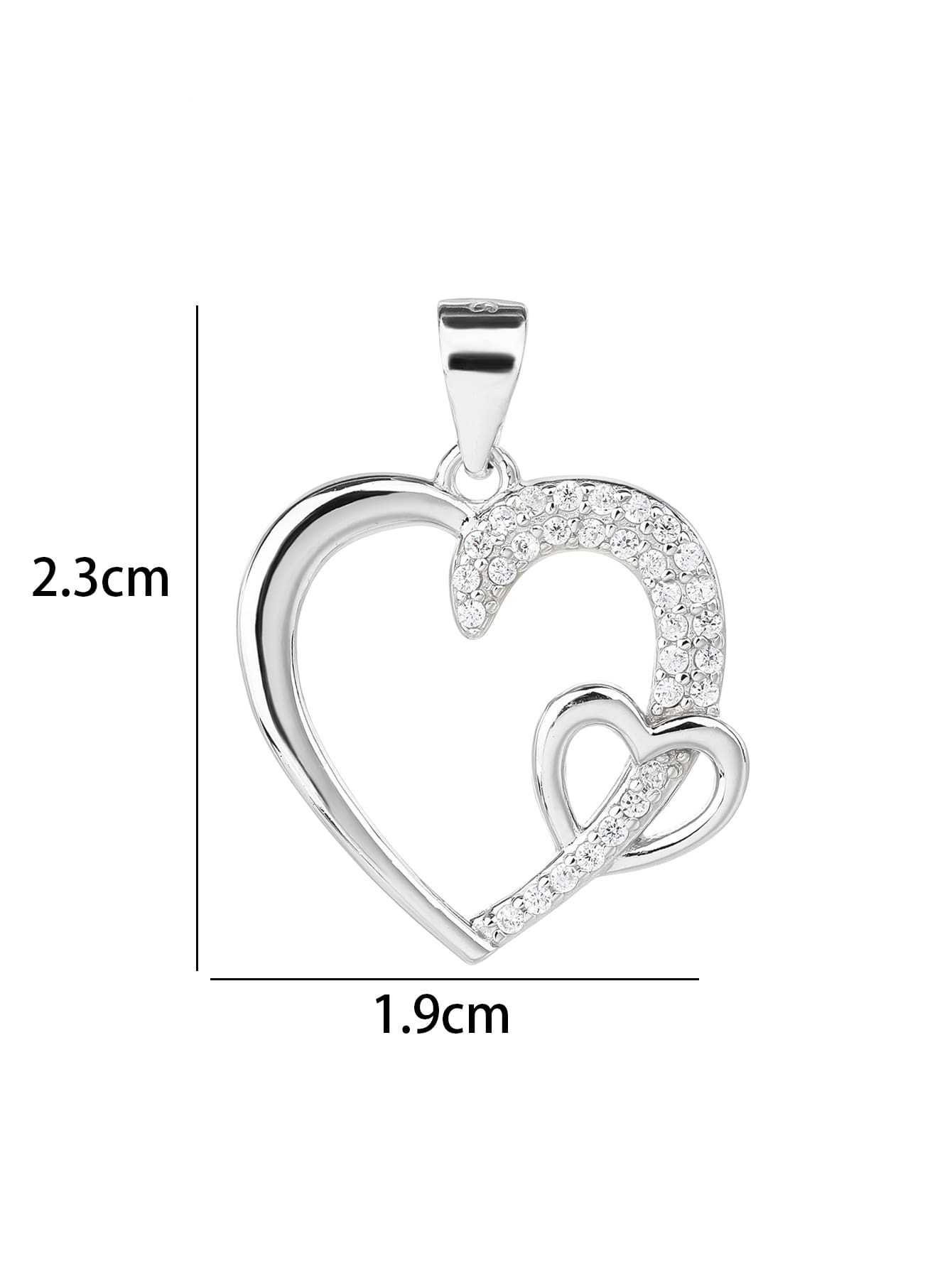 One heart is set with white cubic zirconia stones, giving the pendant an elegant sparkle.