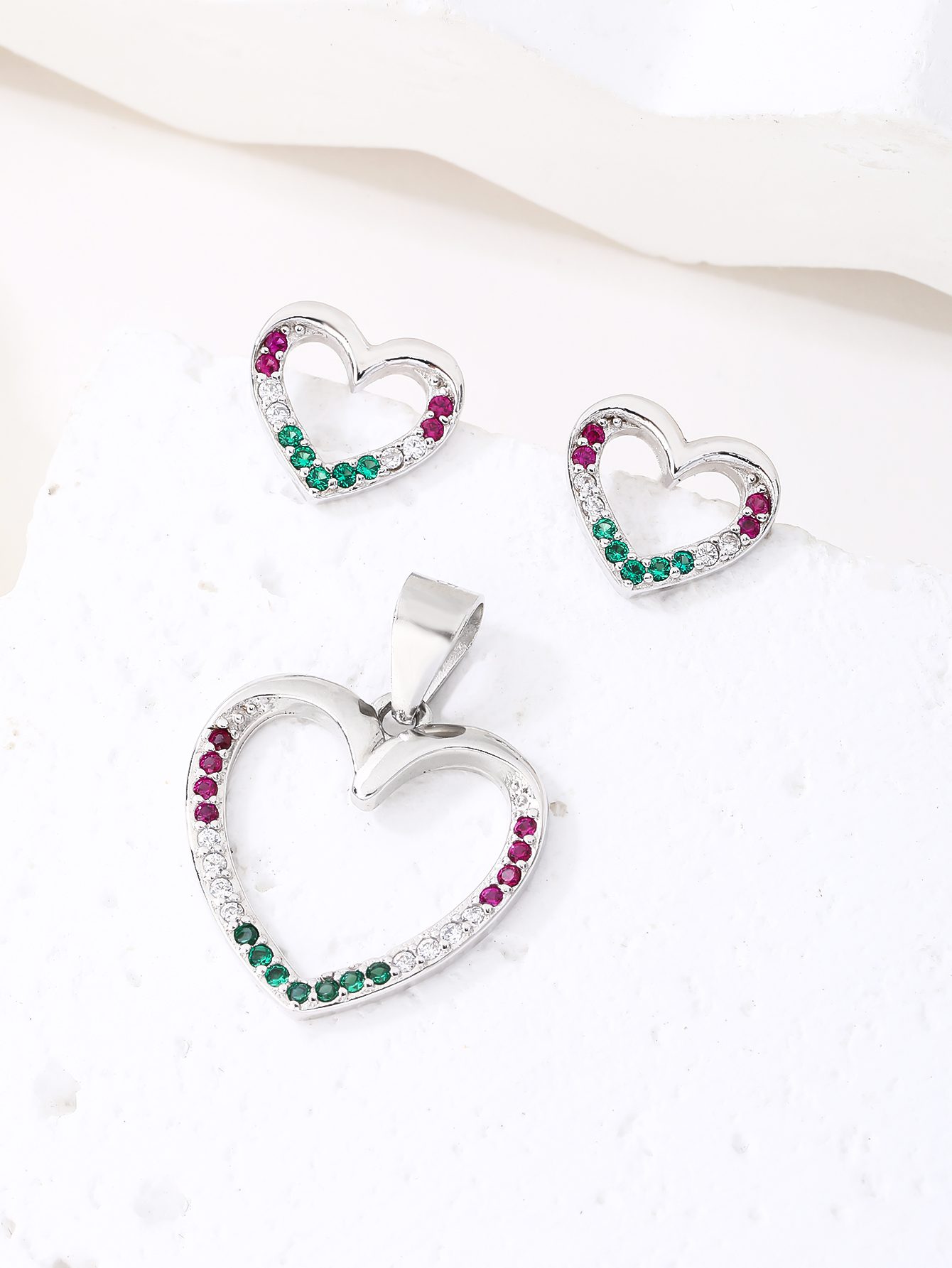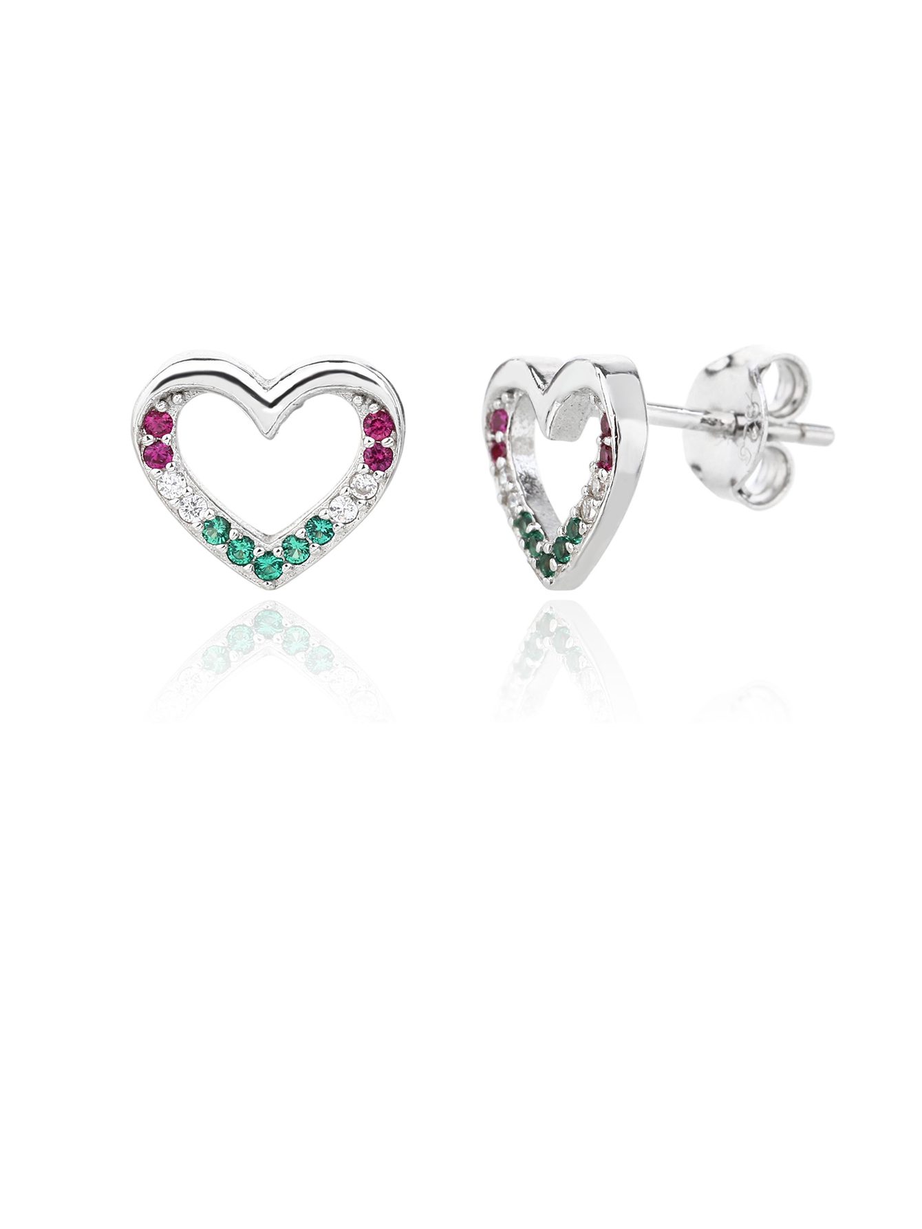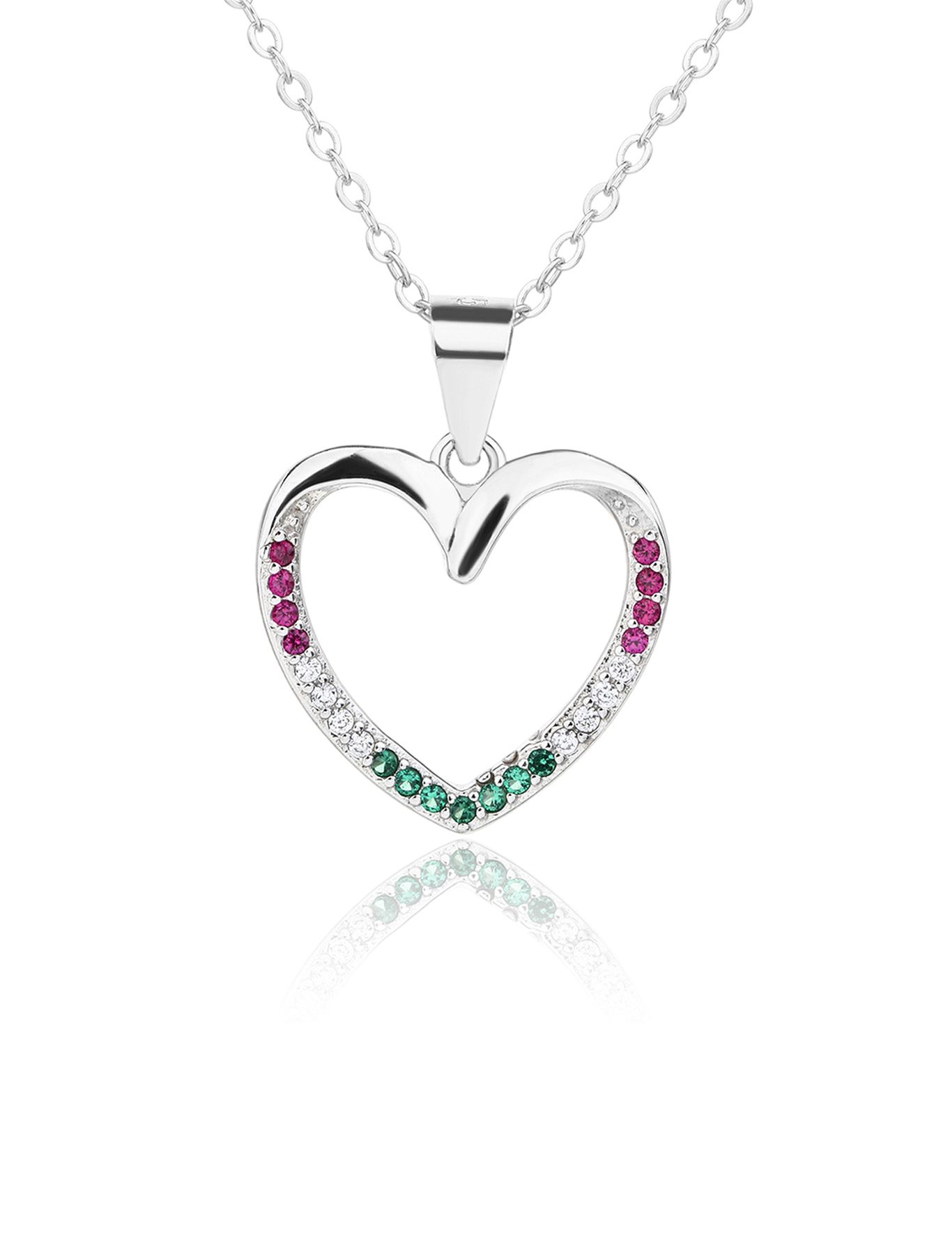 A piros, fehér és zöld cirkónia kövek finoman követik a vonalat, mintha természetesen simulnának bele a szív mozdulatába.