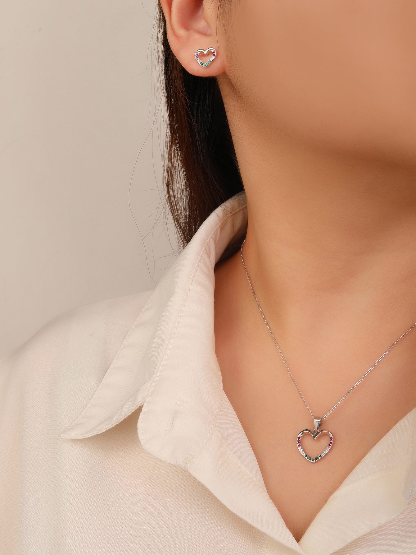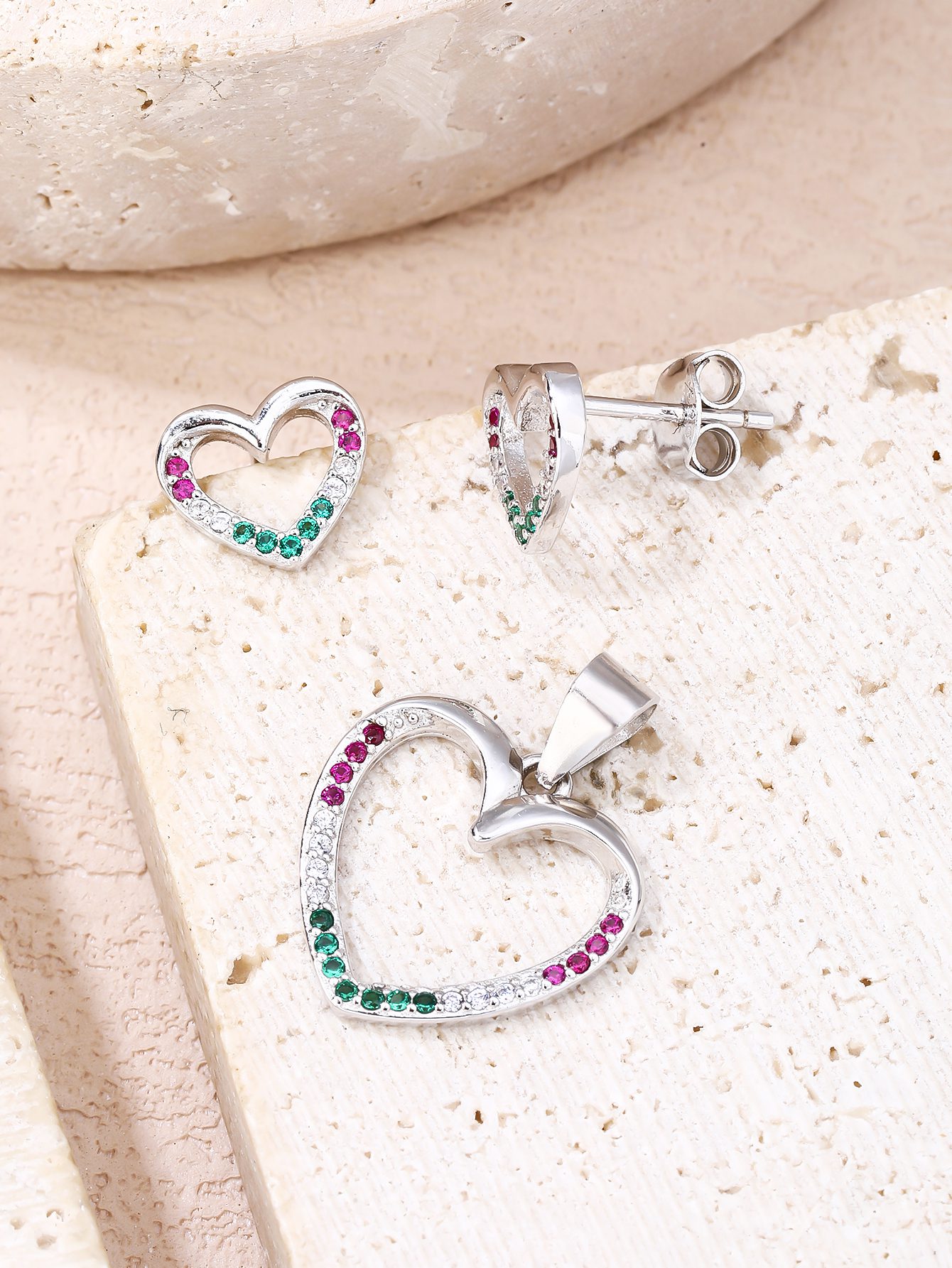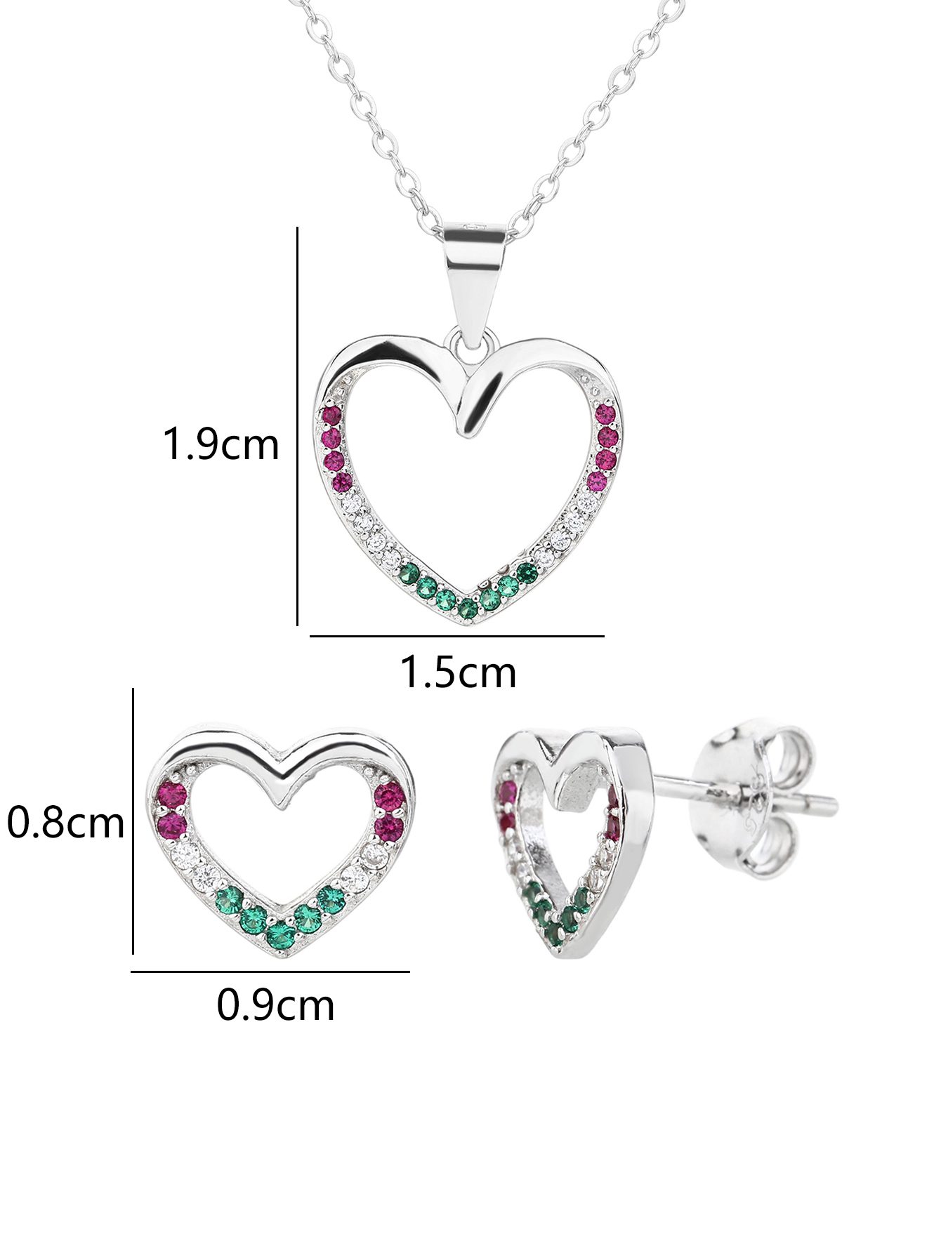 A piros, fehér és zöld cirkónia kövek finoman követik a vonalat, mintha természetesen simulnának bele a szív mozdulatába.