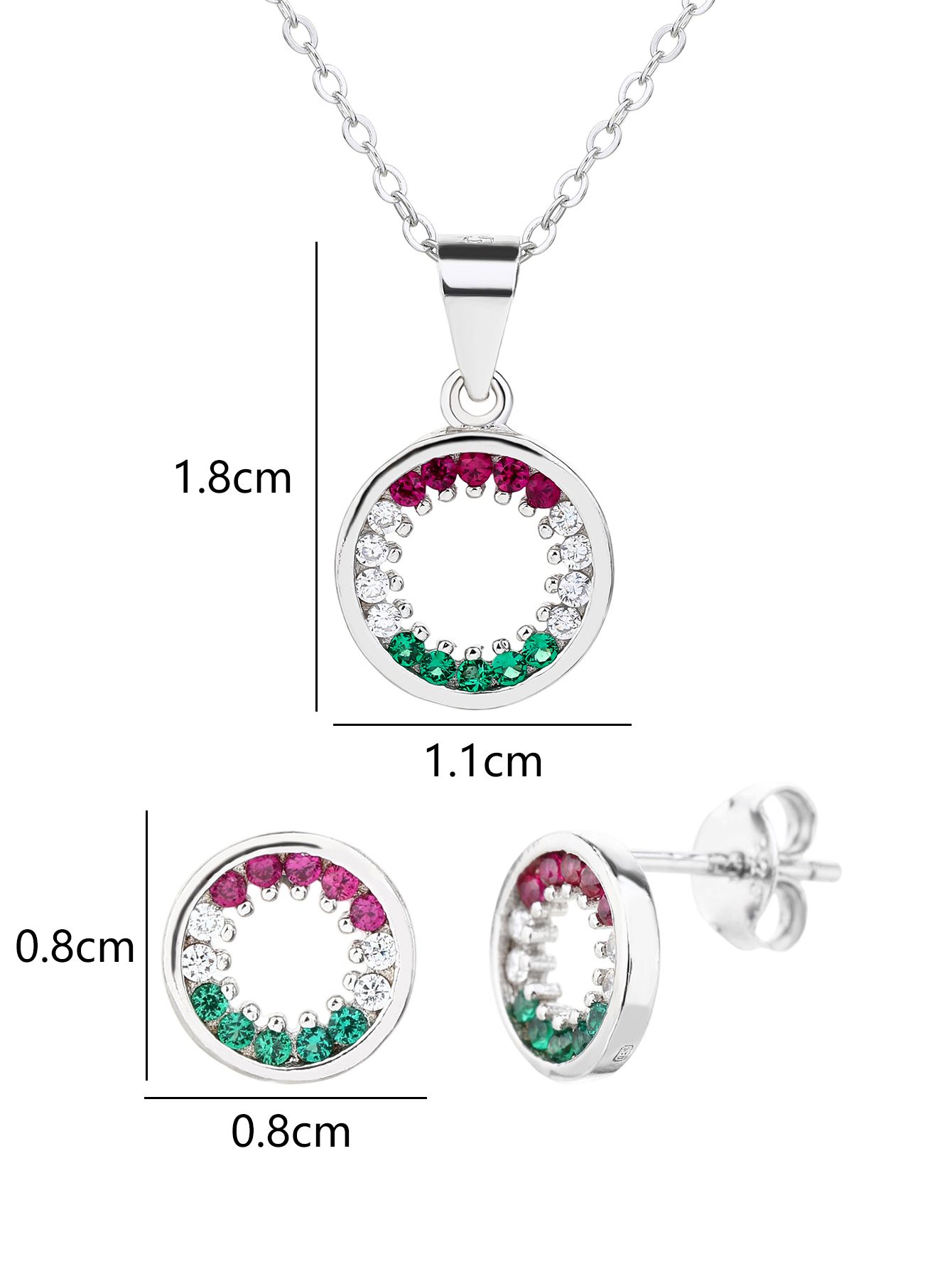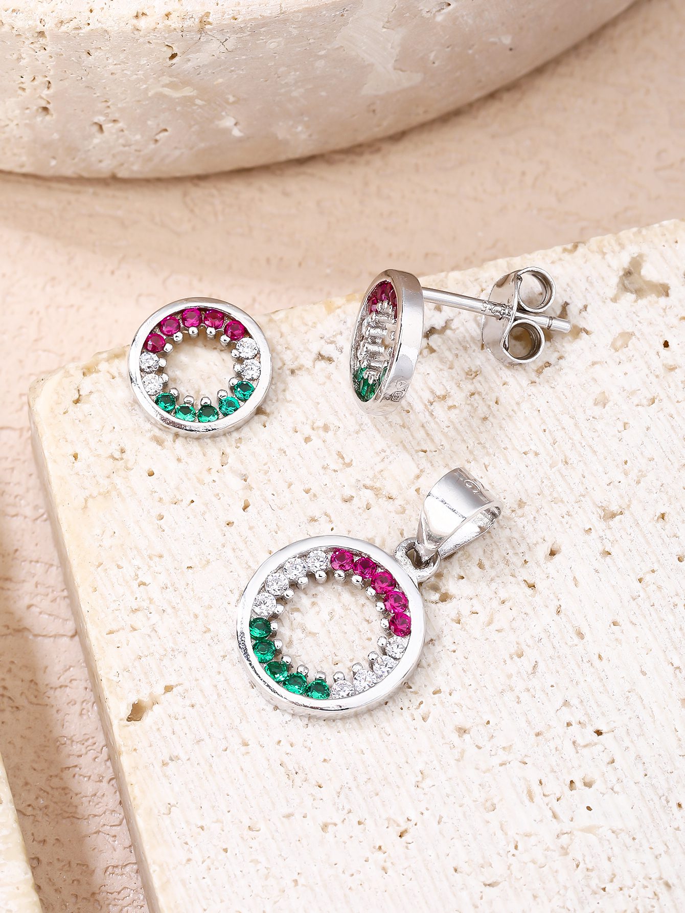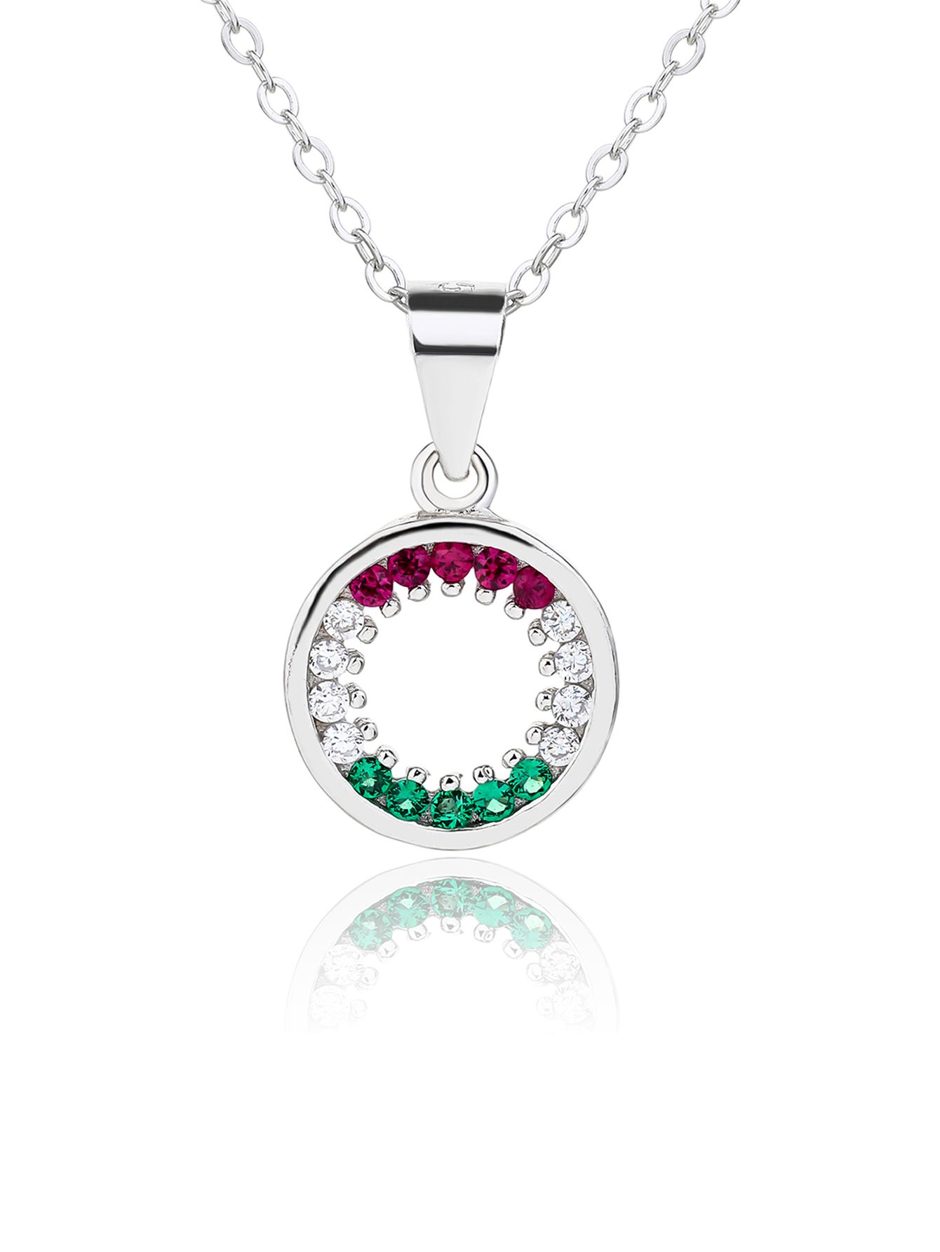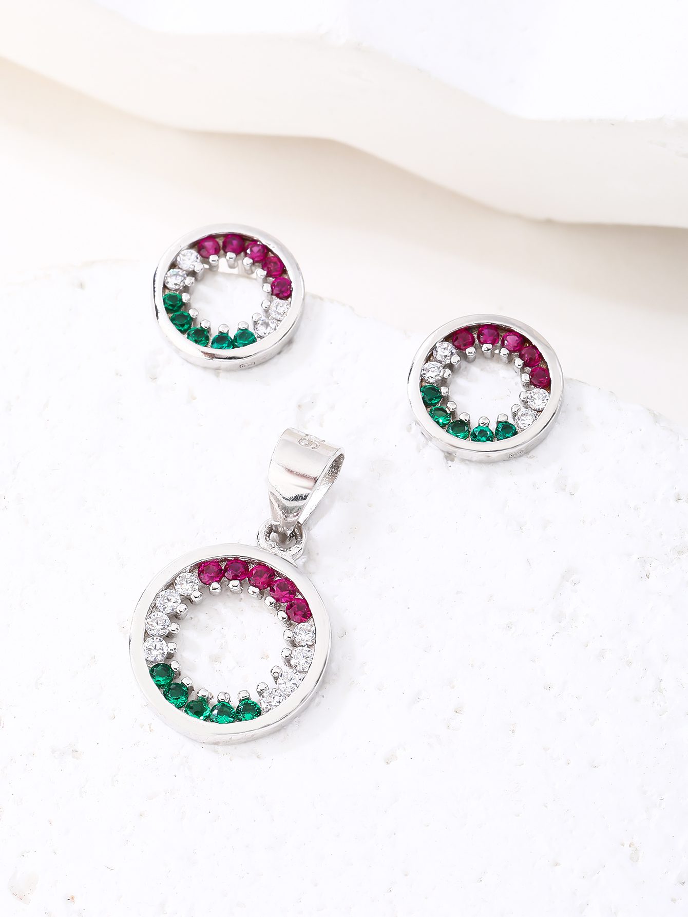 Ebben a finoman megmunkált, AG 925 sterling ezüst foglalatban a piros, fehér és zöld cirkónia kövek harmonikus ívben követik egymást. Nem dominálnak, nem hivalkodnak – mégis azonnal felismerhető jelentést hordoznak.