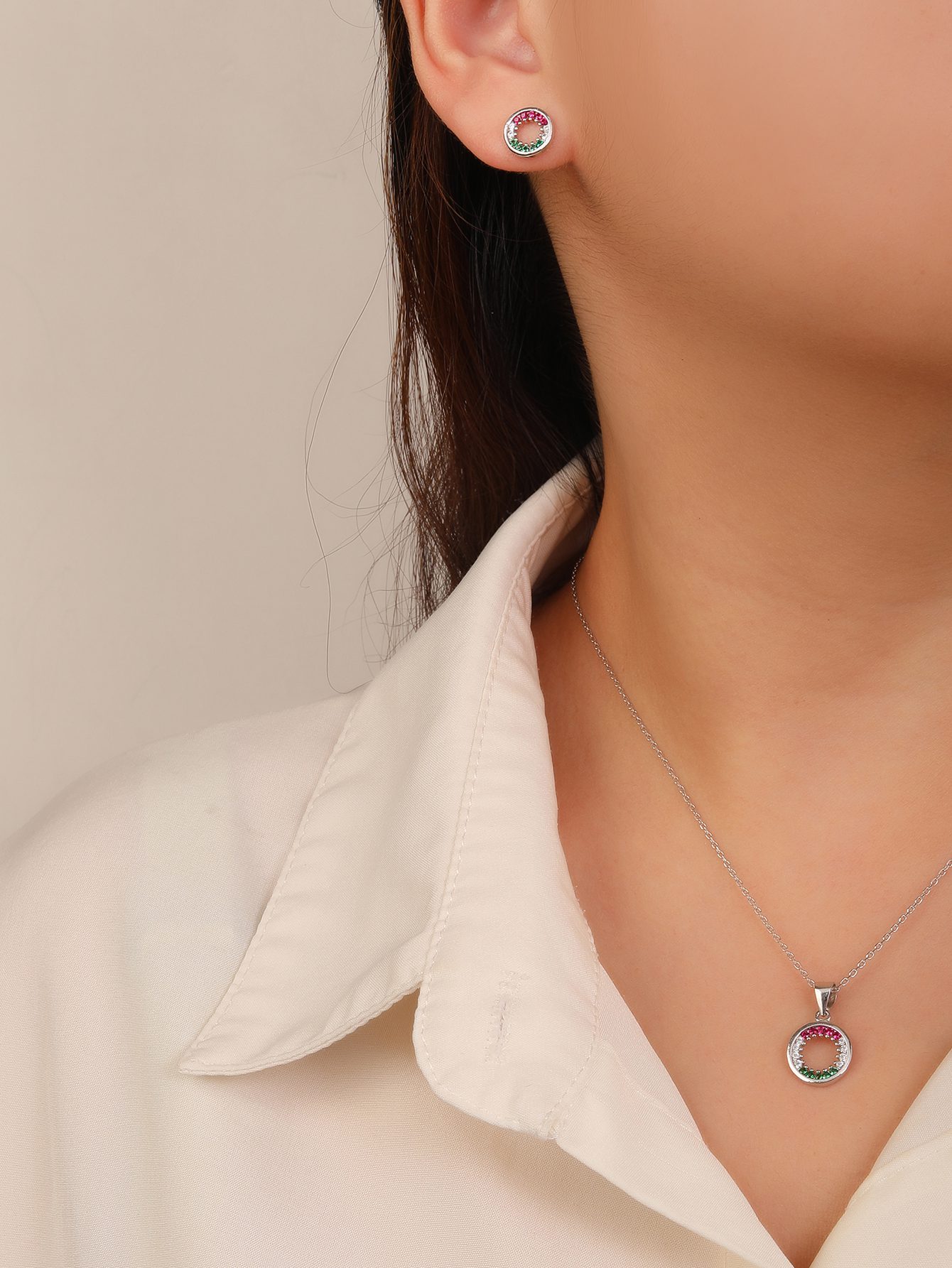 A medál és a fülbevaló együtt kiegyensúlyozott, nőies összhatást ad – letisztult formája miatt hétköznap és elegáns alkalmakon is viselhető.