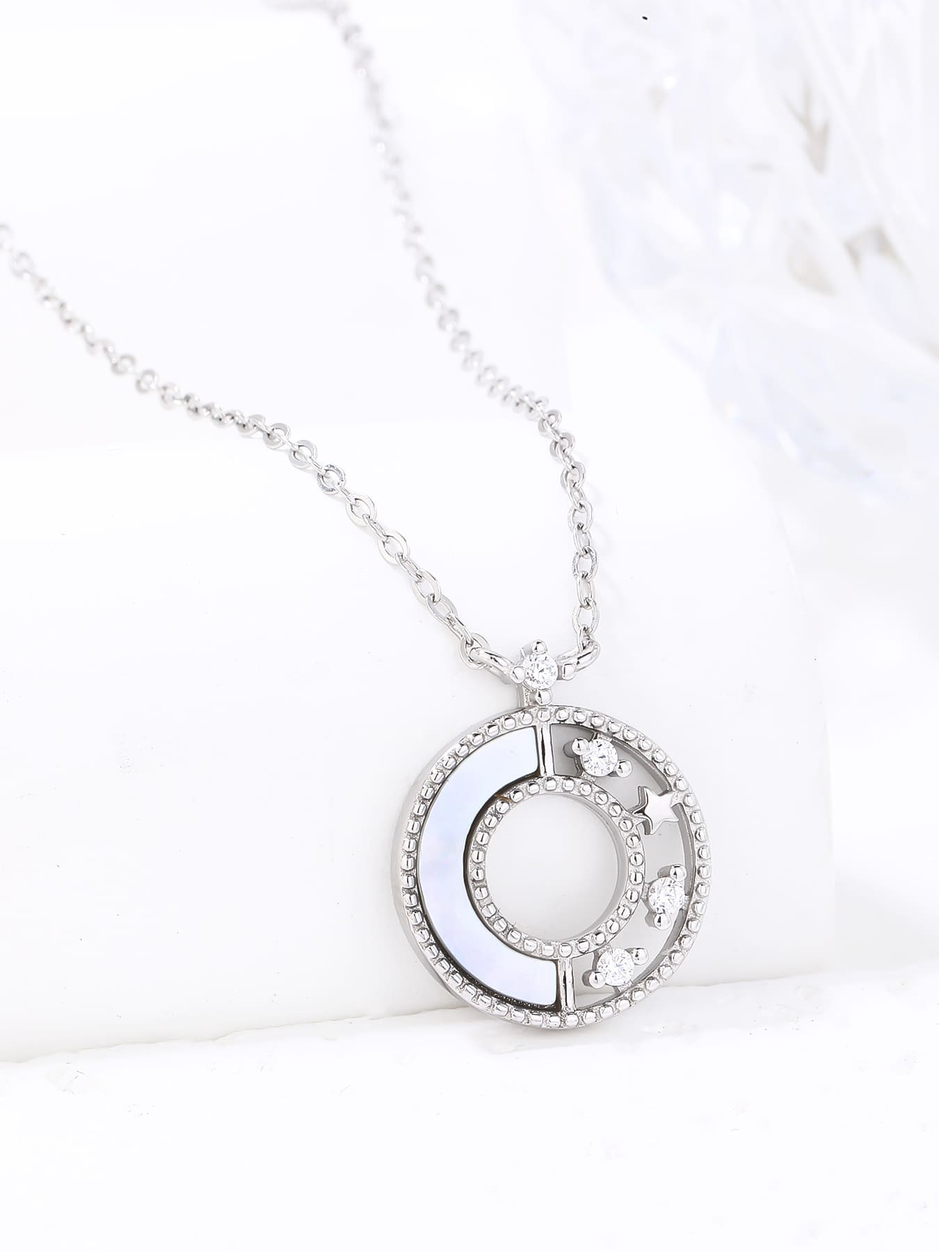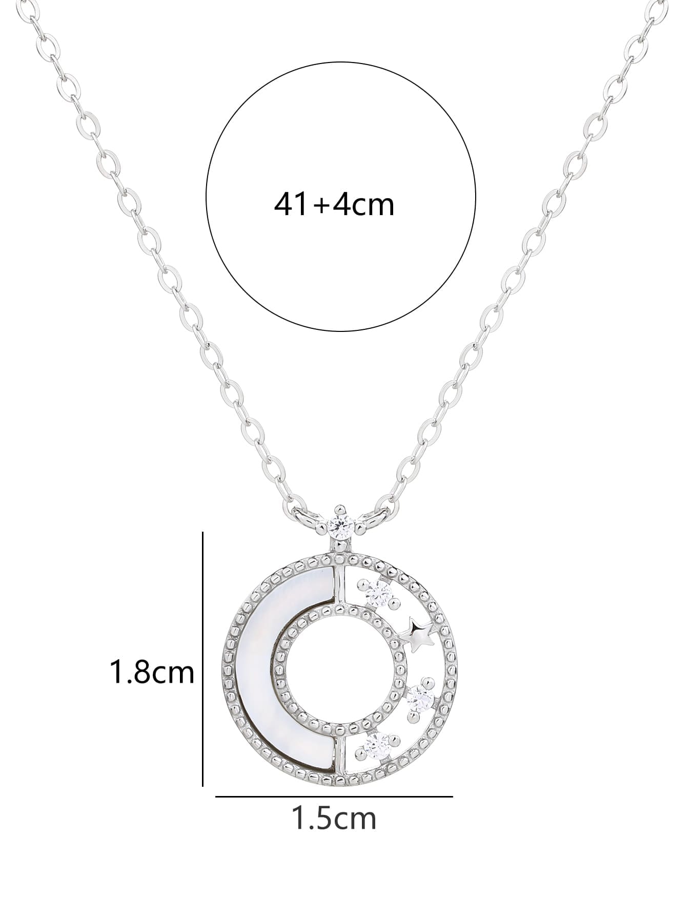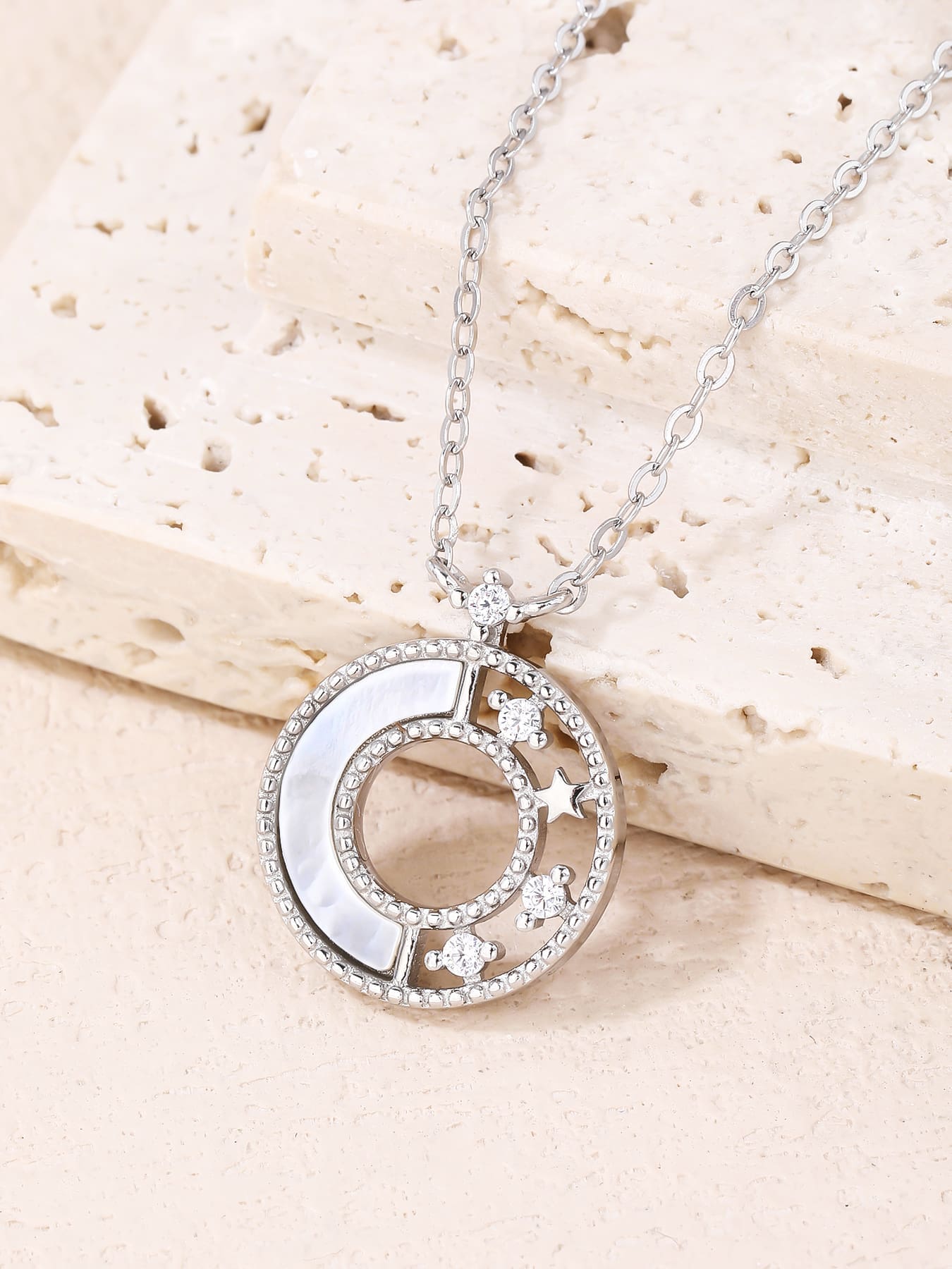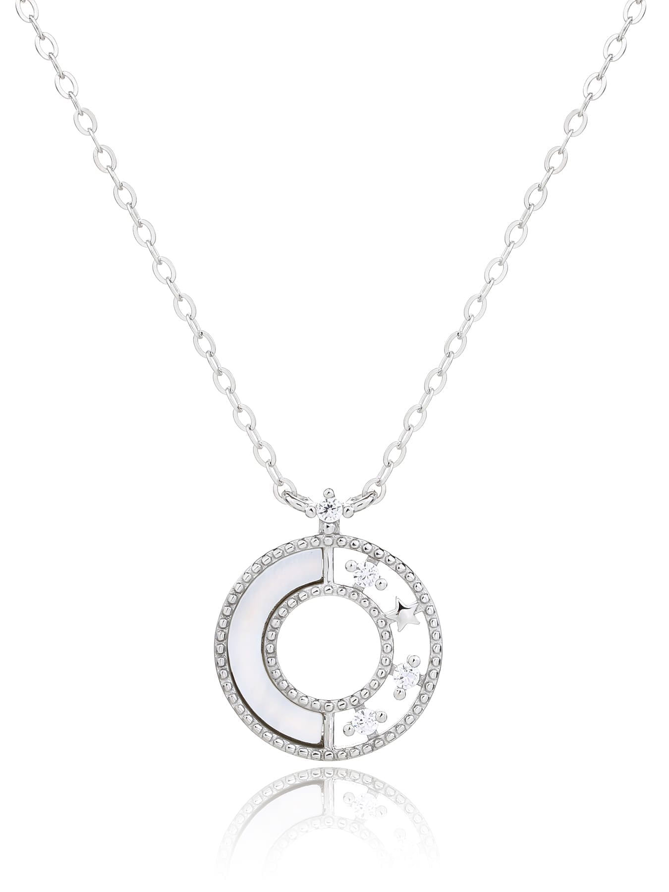 This star and moon inspired necklace is made from AG 925 sterling silver with a delicate rhodium plating for a long lasting shine. The circular and crescent shape is a symbol of infinity and cyclicality, made special by the shimmering zirconia and pearlescent inlays. The 45+4 cm chain is adjustable to fit any neck size.