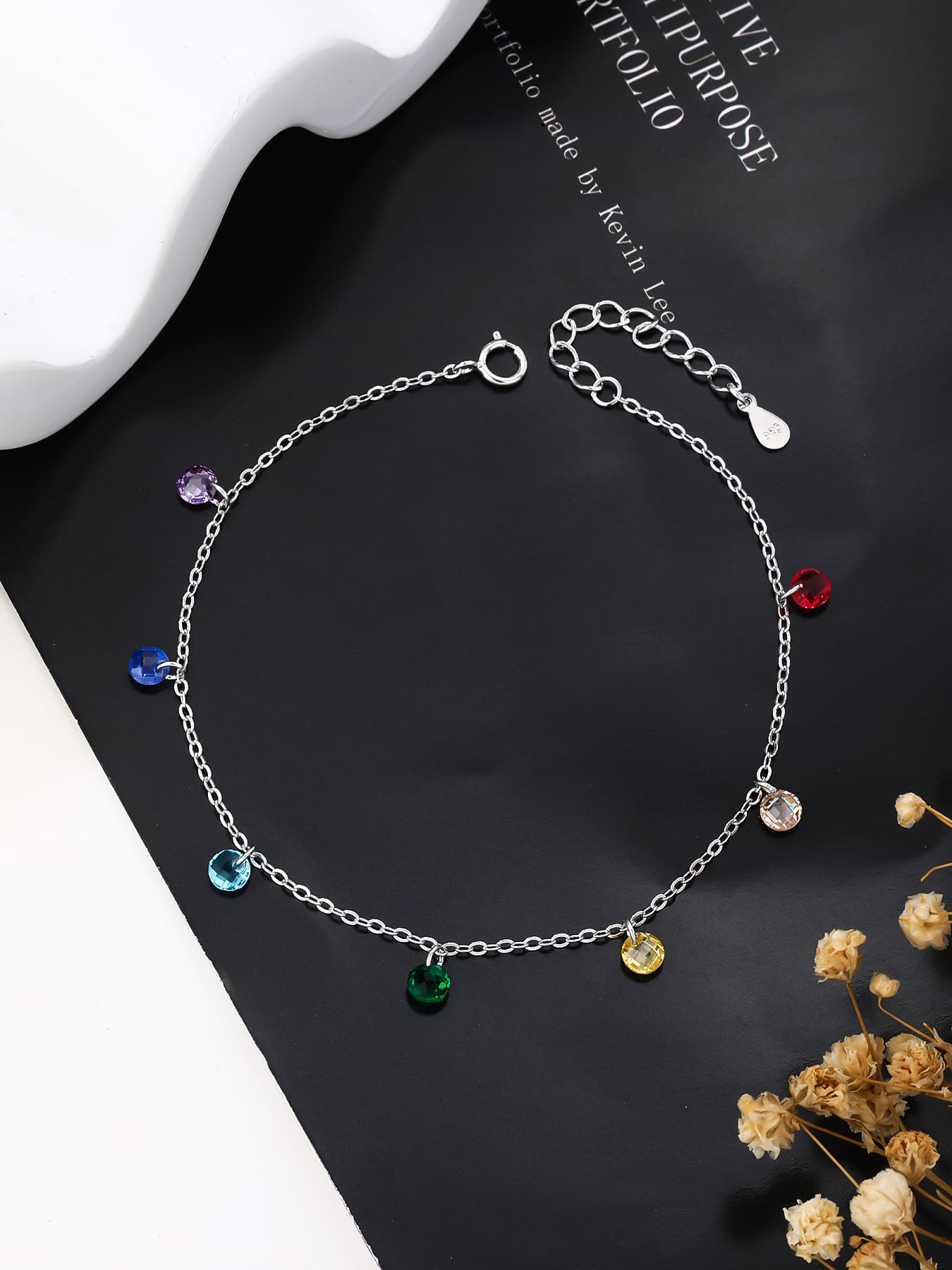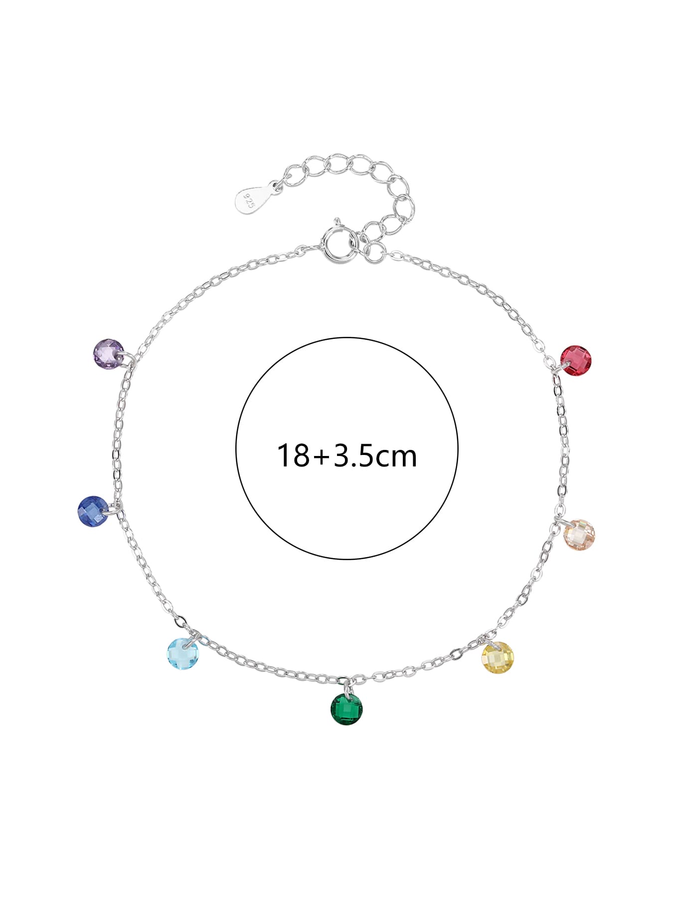 This special bracelet is decorated with seven tiny cubic zirconia stones in the colours of the rainbow. The subtly sparkling stones are set on AG 925 silver chain, which is rhodium-plated to preserve its shine and protect against discolouration over time. The adjustable 18 + 3.5 cm length ensures comfortable wear for any wrist size.