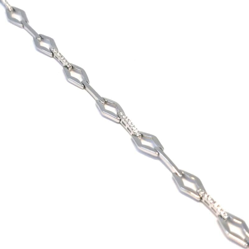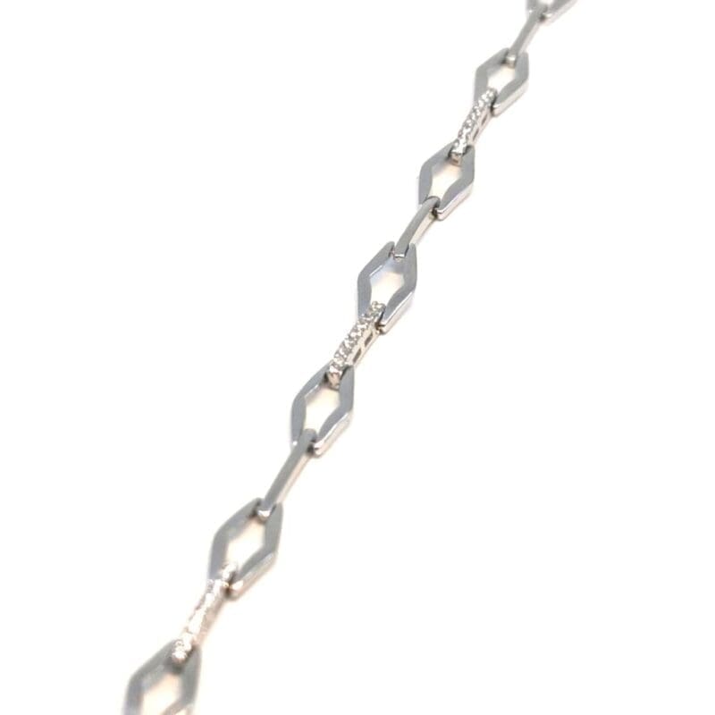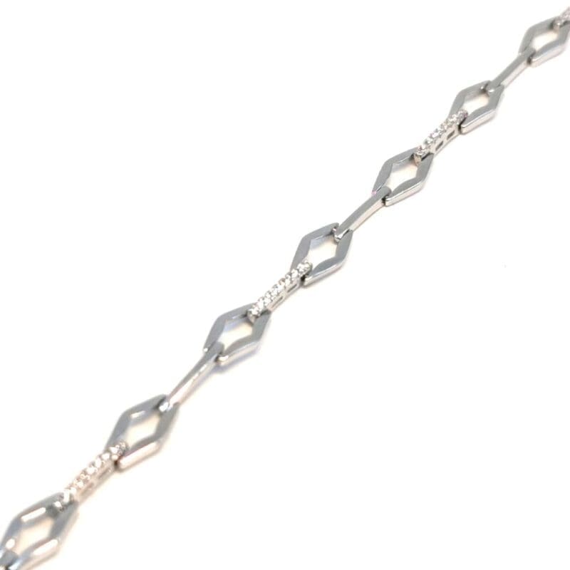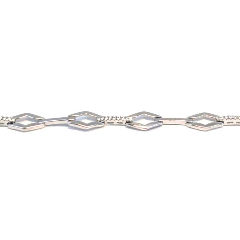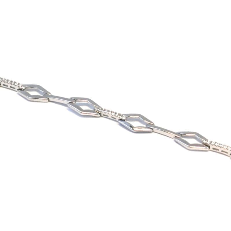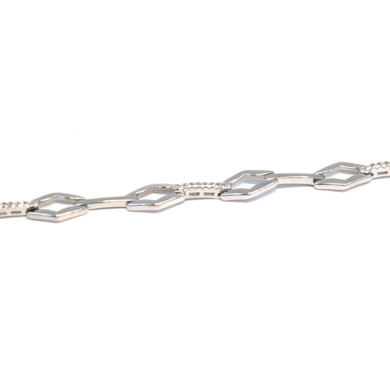 This 925 sterling silver bracelet has a modern and sophisticated diamond shape decoration for a unique look. Precisely placed white cubic zirconia stones add a subtle sparkle to the jewellery, while the rhodium plating protects the silver from discolouration and wear over time.