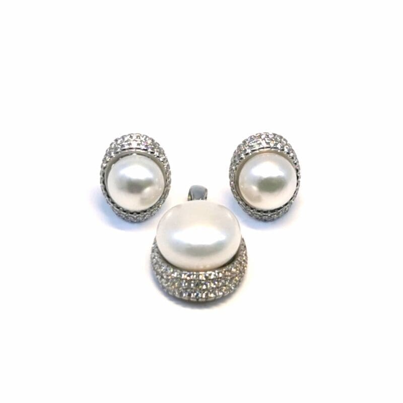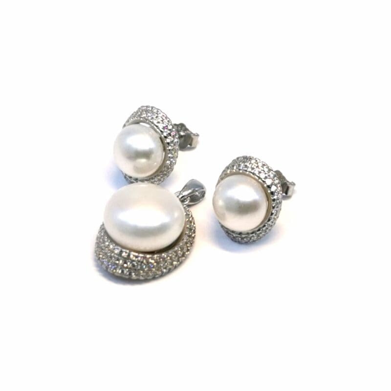 White stone oval pearl silver stud earrings and pendant set – sophisticated glamour for every occasion!
