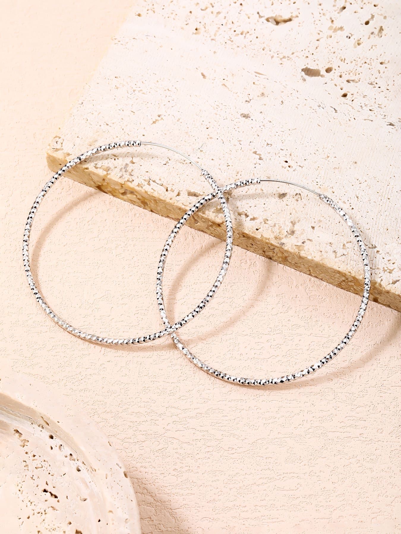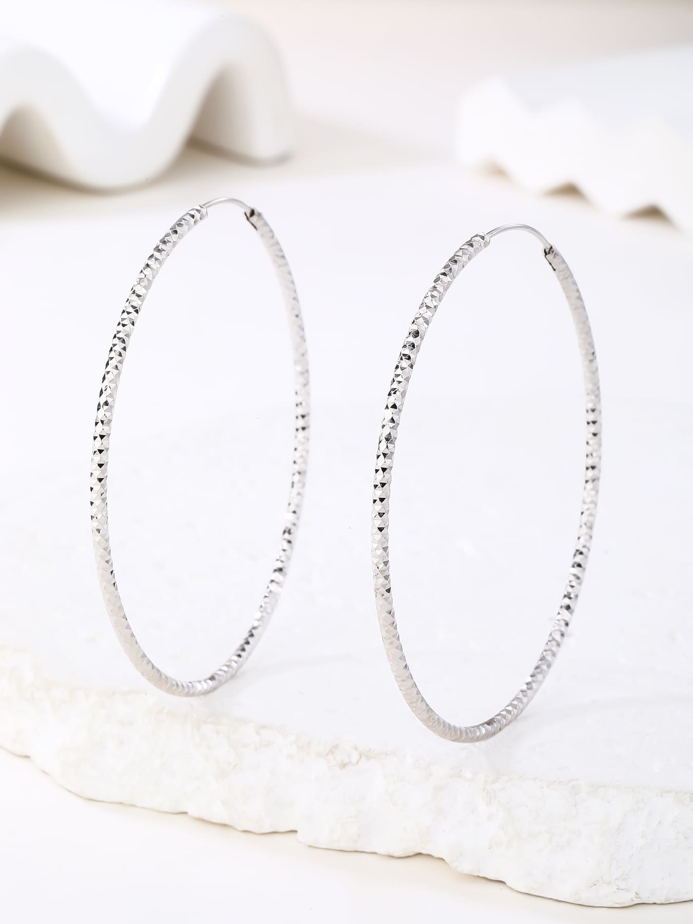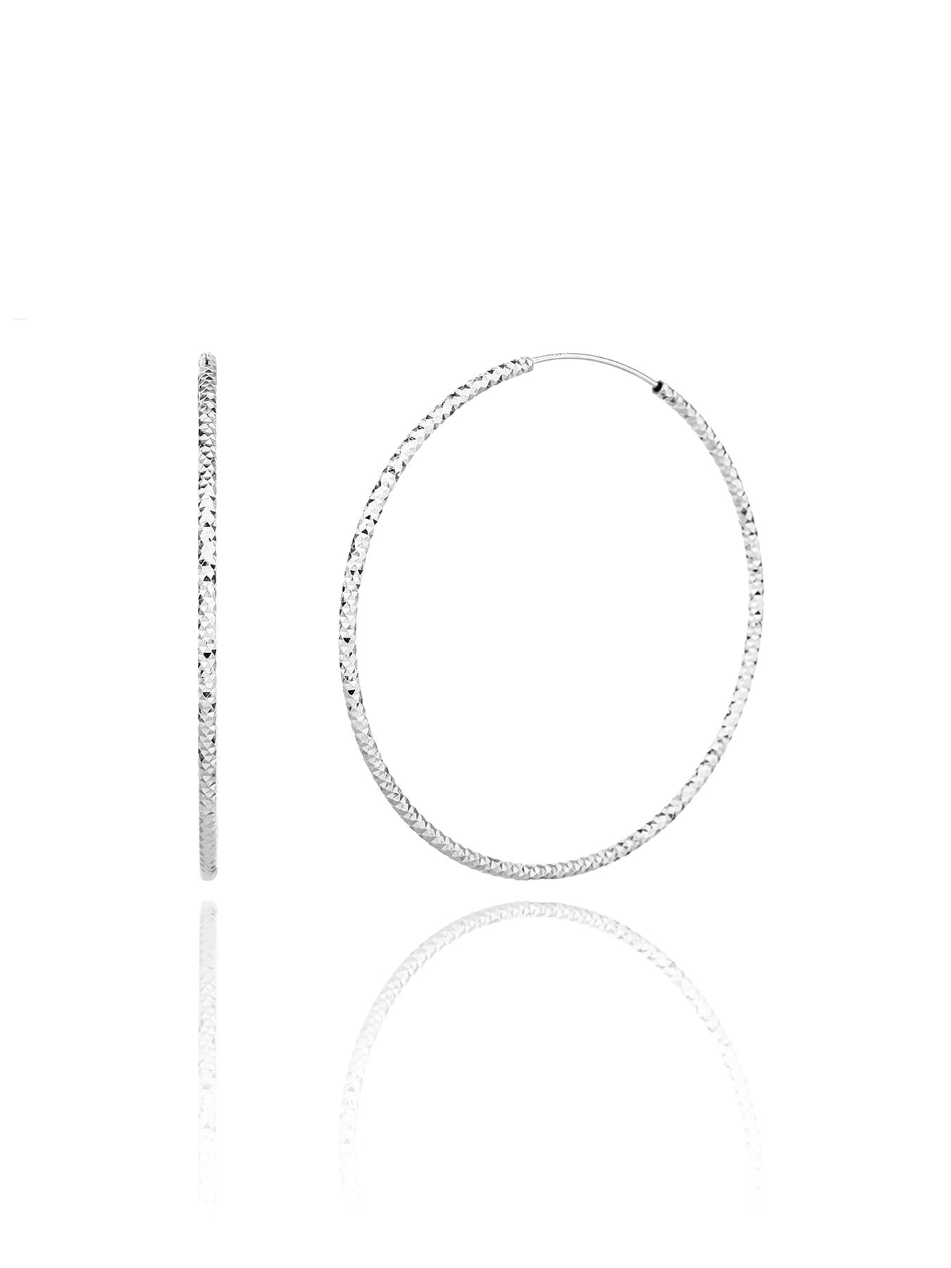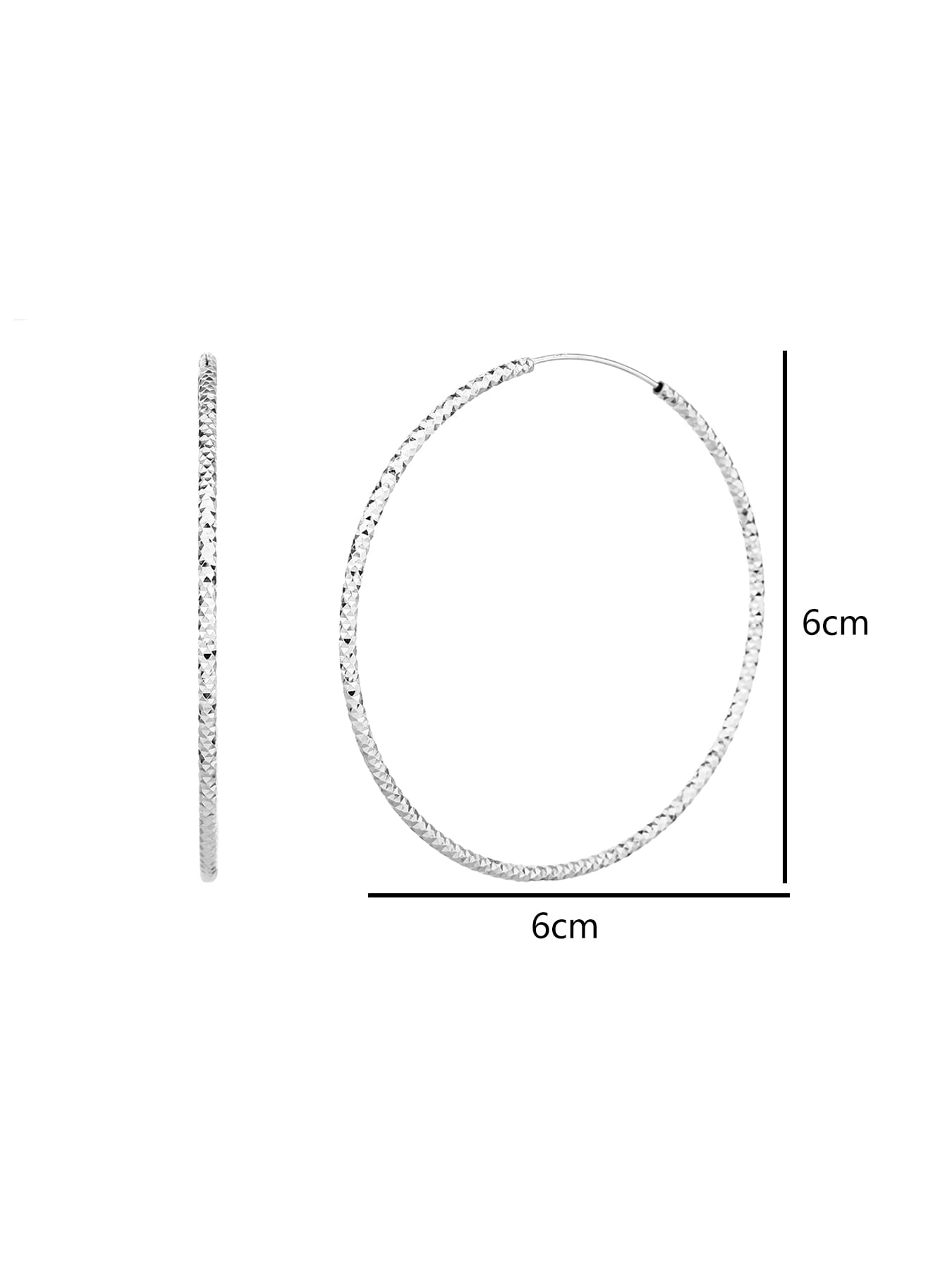 Ez a nagyméretű karika fülbevaló a klasszikus formavilágot ötvözi a gyémánt vésett felület egyedi csillogásával. A 6 cm-es átmérő határozottan feltűnő megjelenést biztosít, amely elegánsan keretezi az arcot és kiemeli nőiességed.
